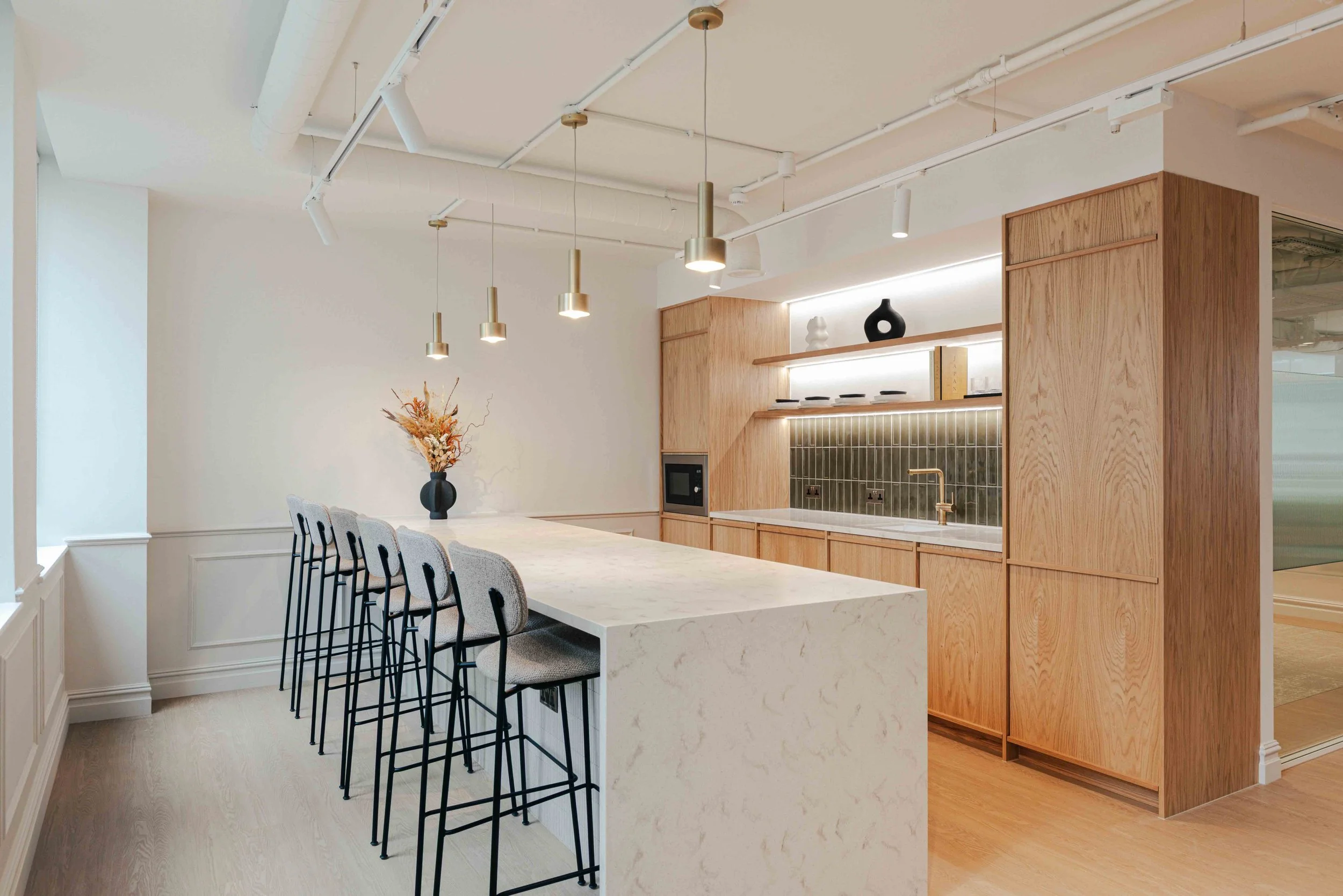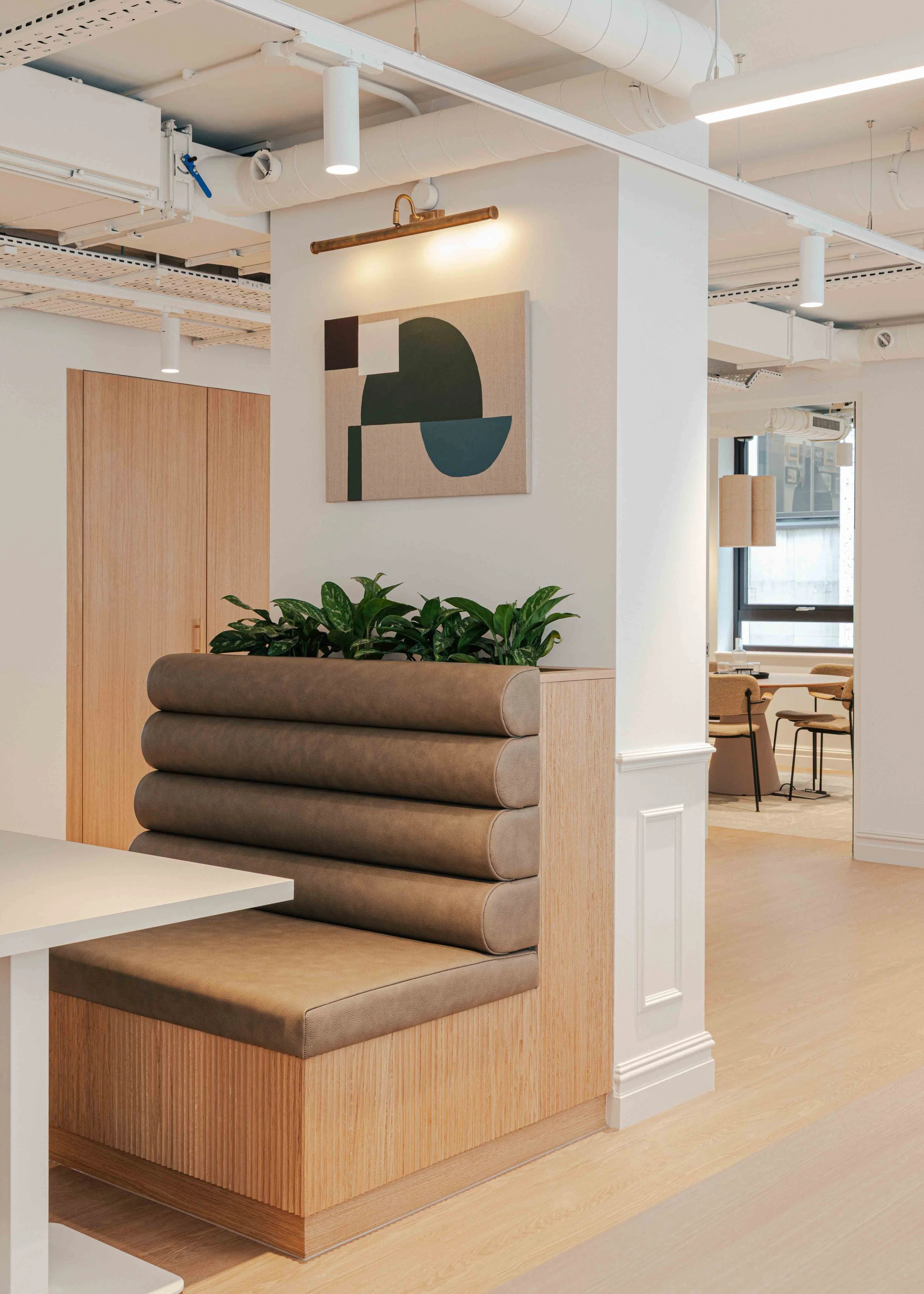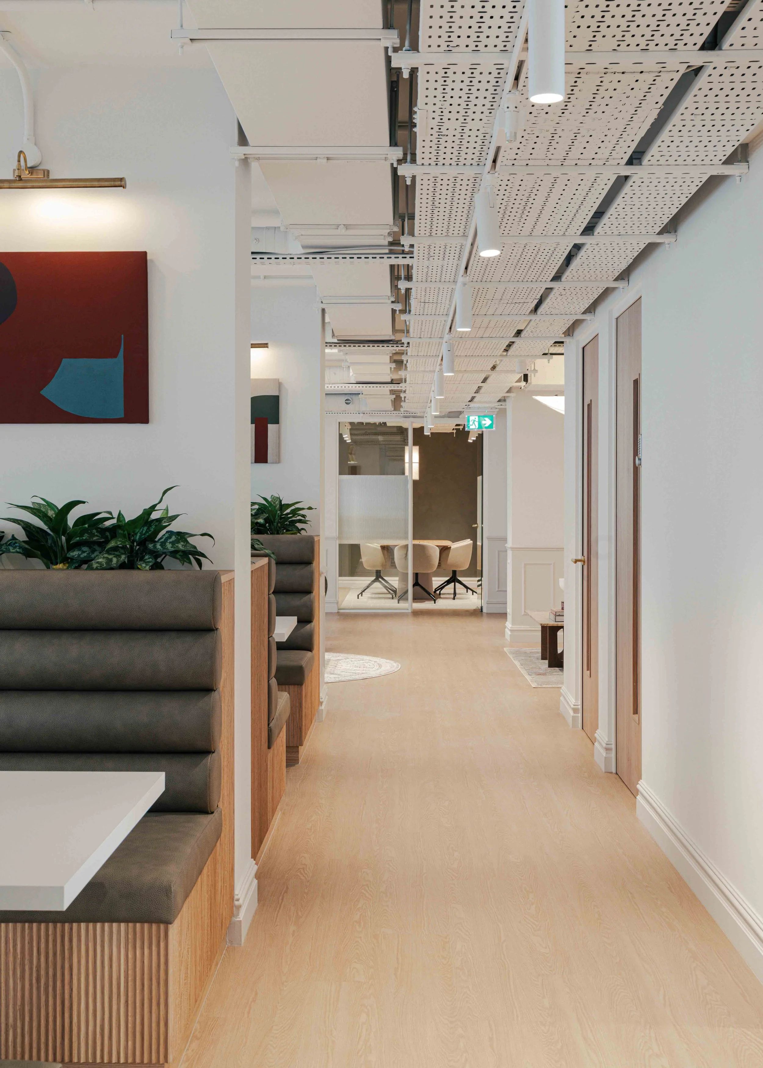 The brief called for a warm and calming arrival experience that moved away from a traditional corporate lobby towards something more inviting and design-led. A bespoke tiled floor anchors the space, adding character and identity from the moment you enter. Warm timber panelling was introduced to soften the environment and bring a residential quality to the reception, creating a welcoming backdrop for the desk and waiting area. Bespoke banquette seating completes the scheme, offering a comfortable, crafted touchpoint that enhances both functionality and atmosphere. Together, these elements deliver a refined, comfortable, and distinctive entrance that sets the tone for the rest of the building.
