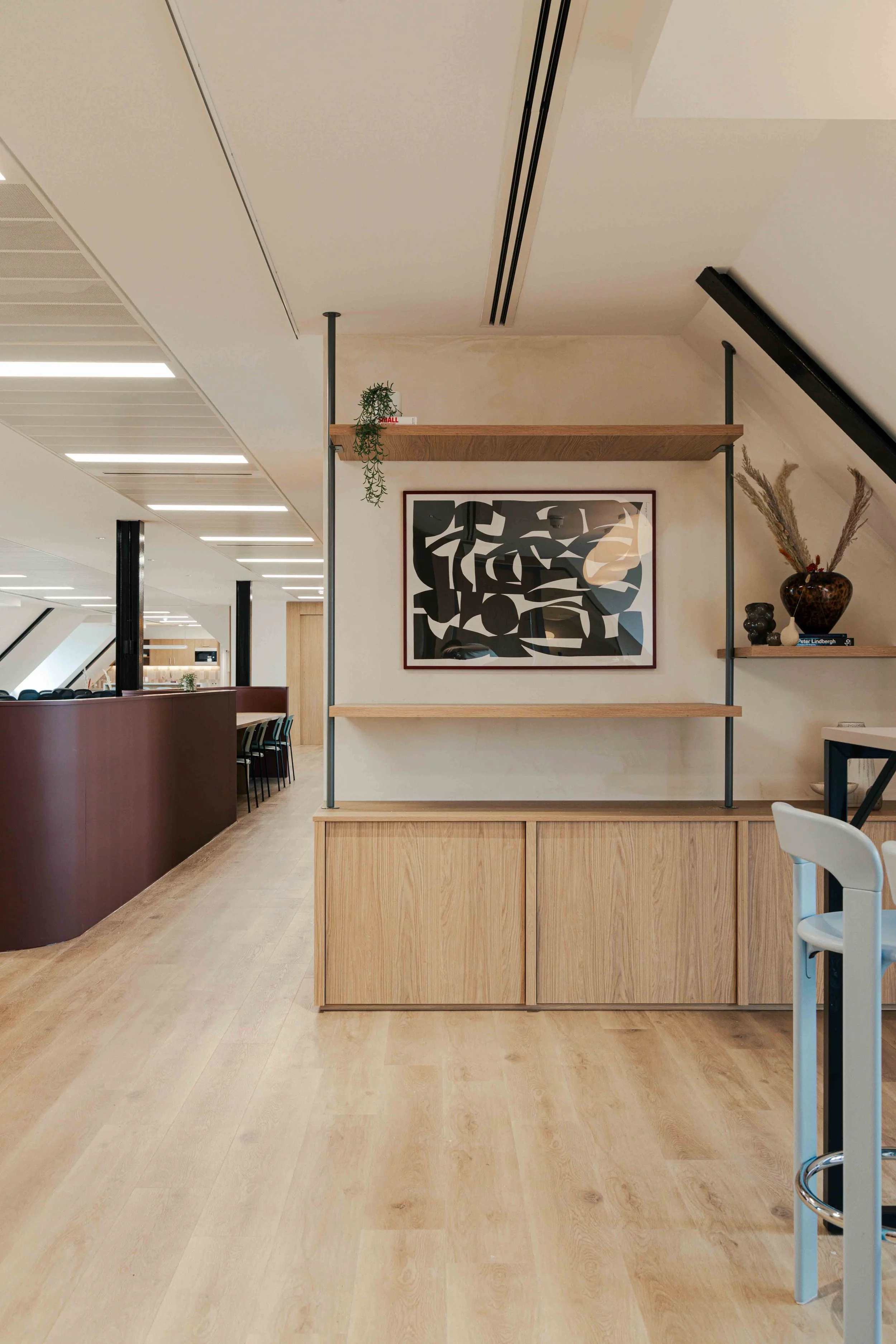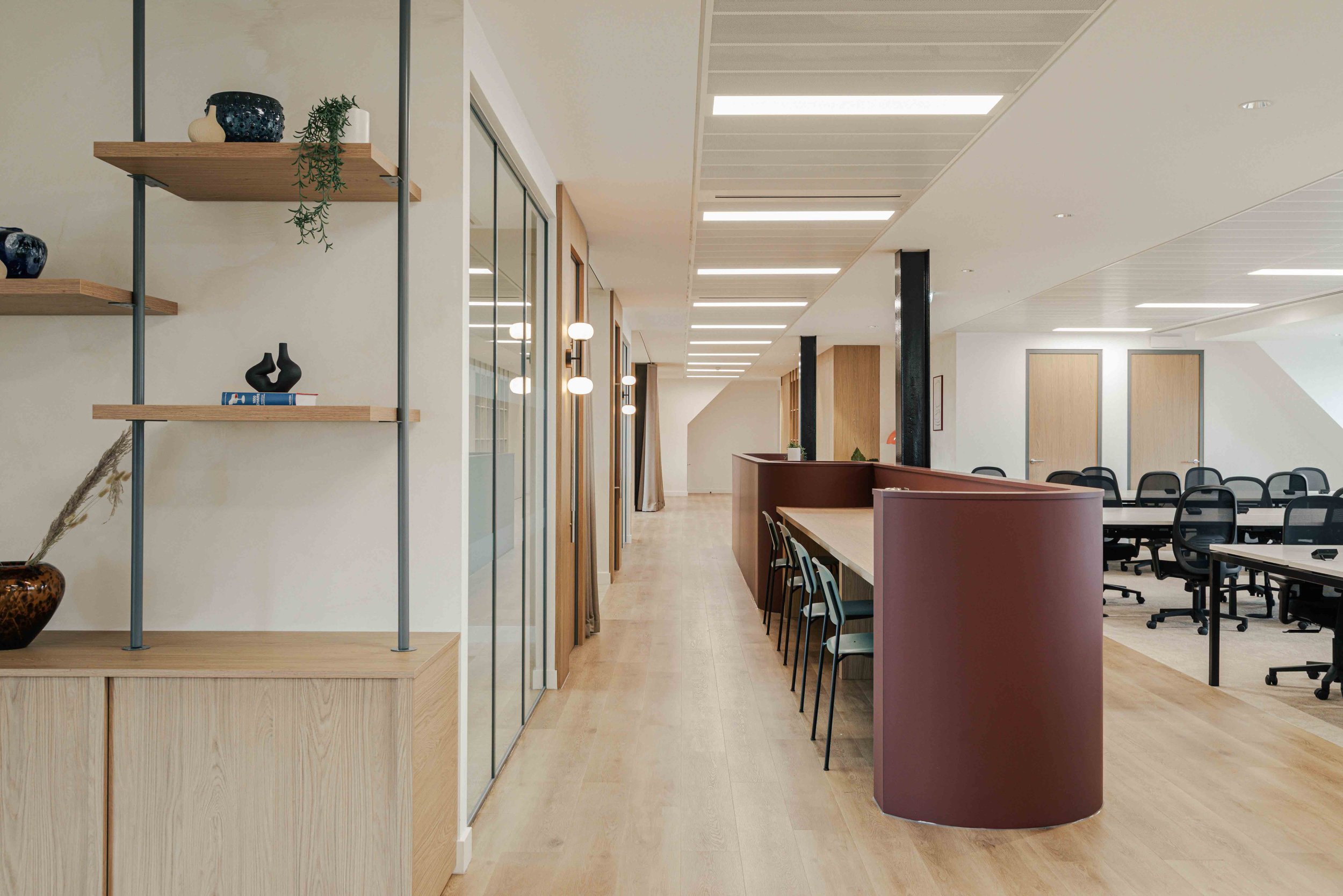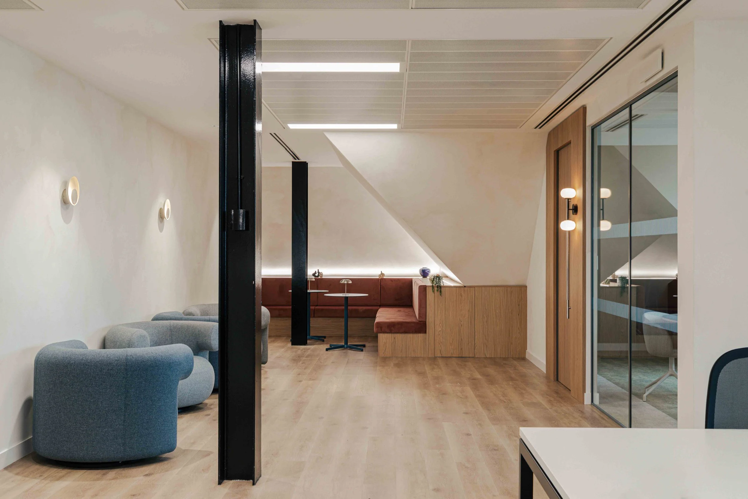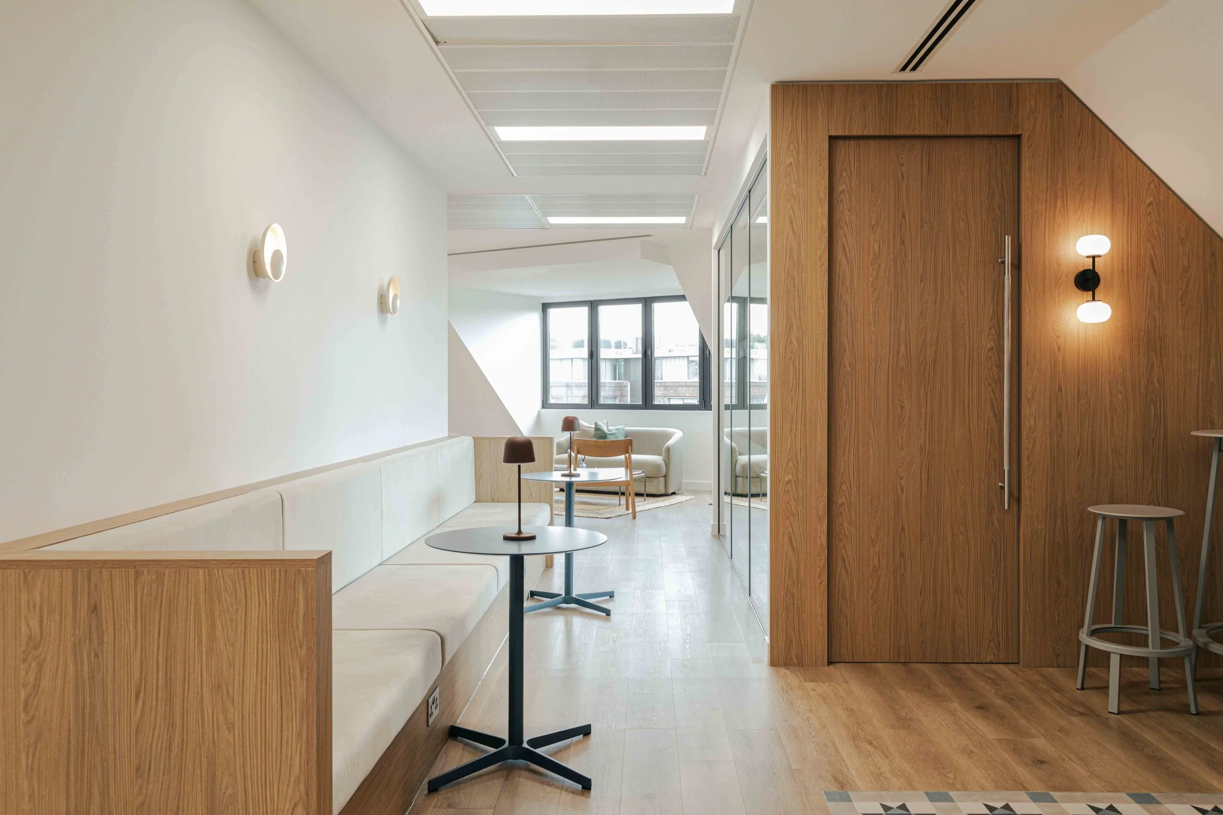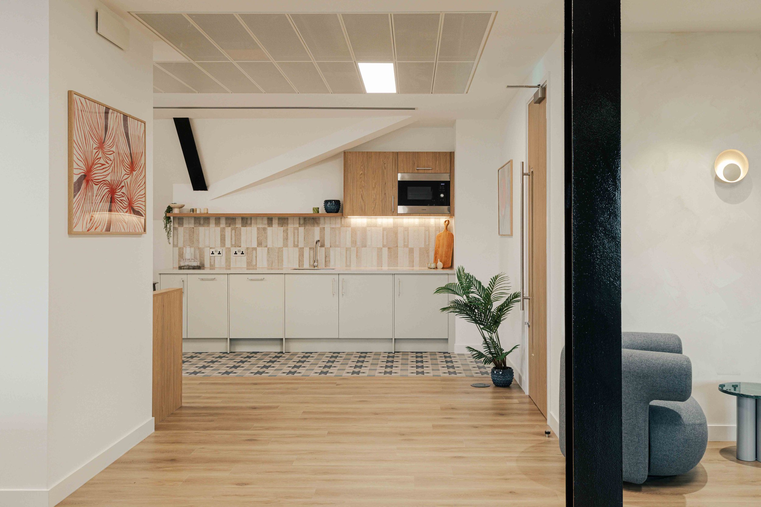 The brief called for a warm and calming arrival experience that moved away from a traditional corporate lobby towards something more inviting and design-led. A bespoke tiled floor anchors the space, adding character and identity from the moment you enter. Warm timber panelling was introduced to soften the environment and bring a residential quality to the reception, creating a welcoming backdrop for the desk and waiting area. Bespoke banquette seating completes the scheme, offering a comfortable, crafted touchpoint that enhances both functionality and atmosphere. Together, these elements deliver a refined, comfortable, and distinctive entrance that sets the tone for the rest of the building.