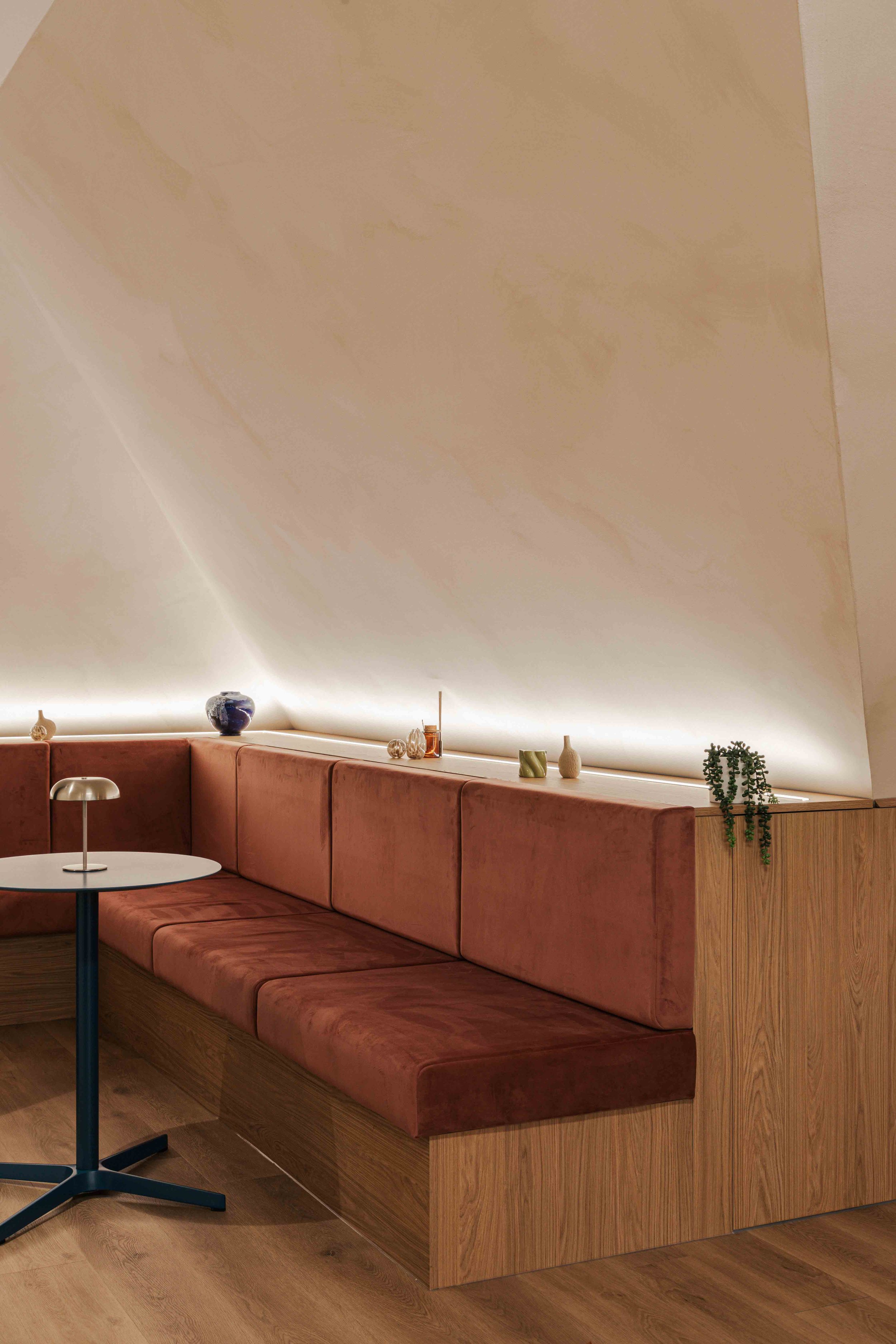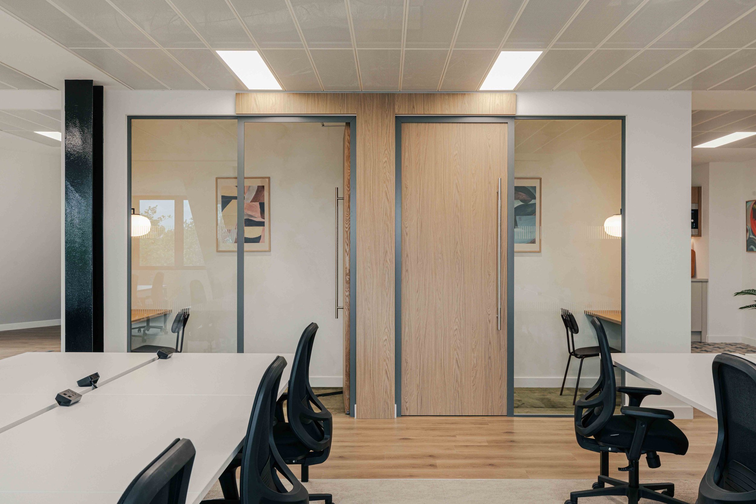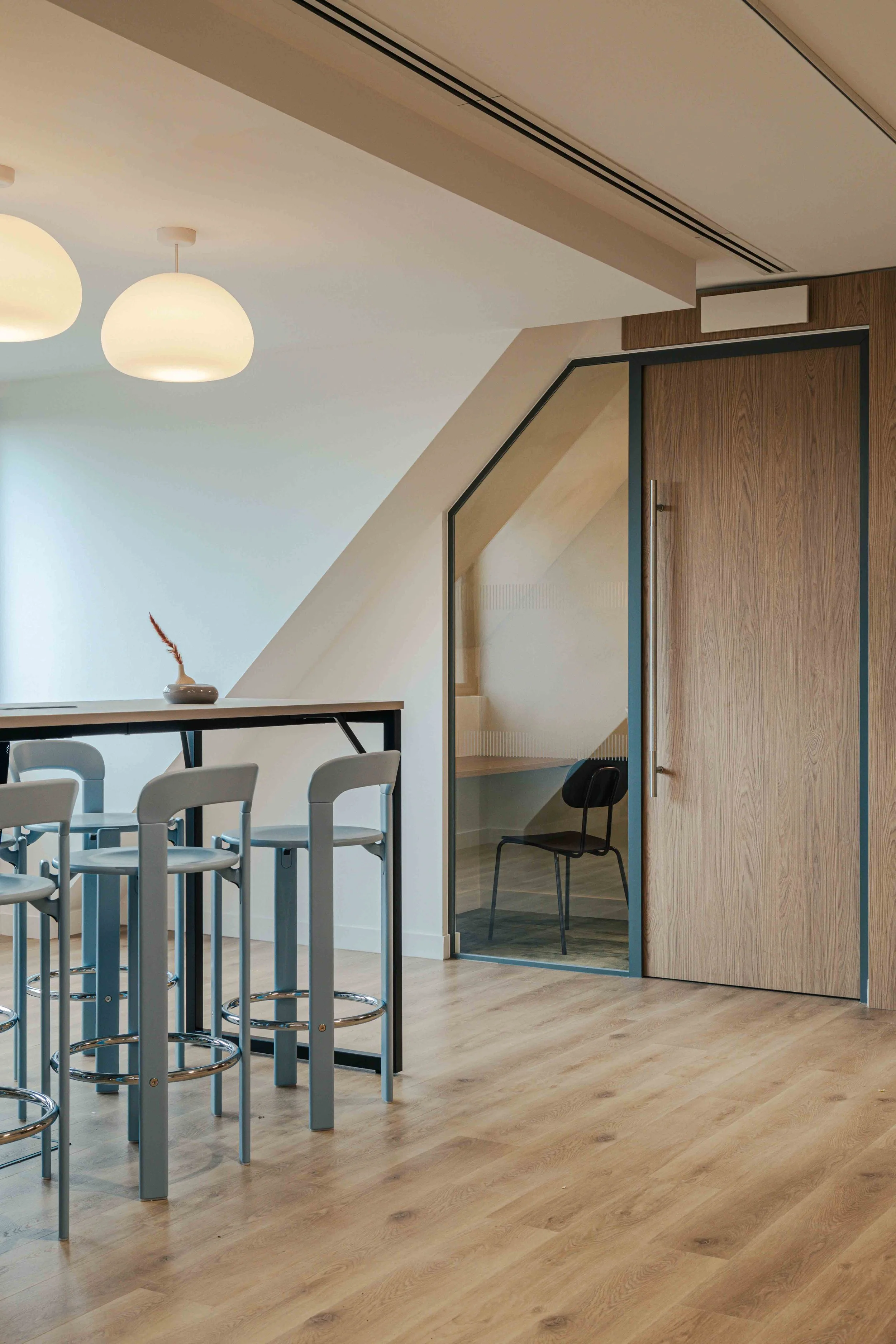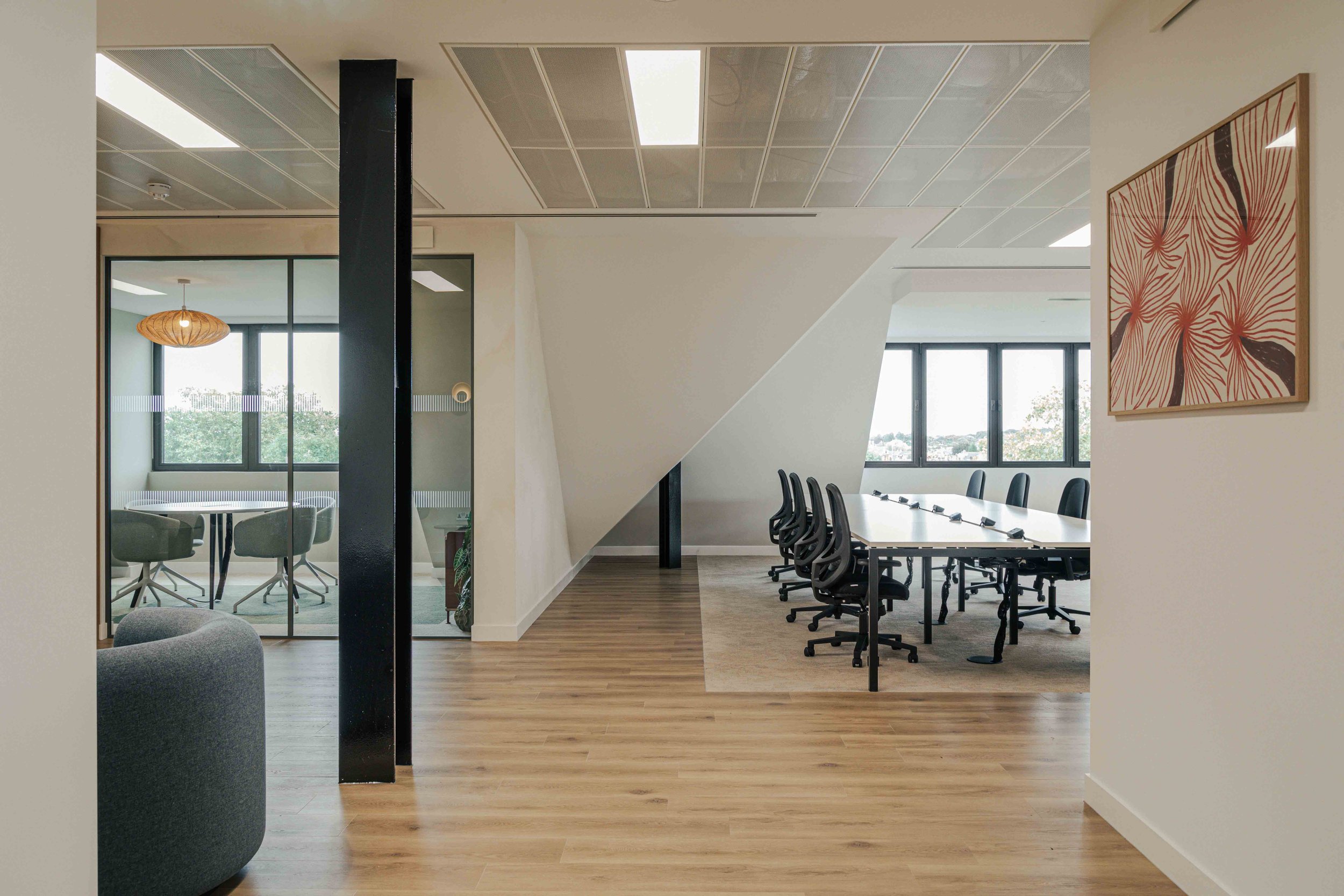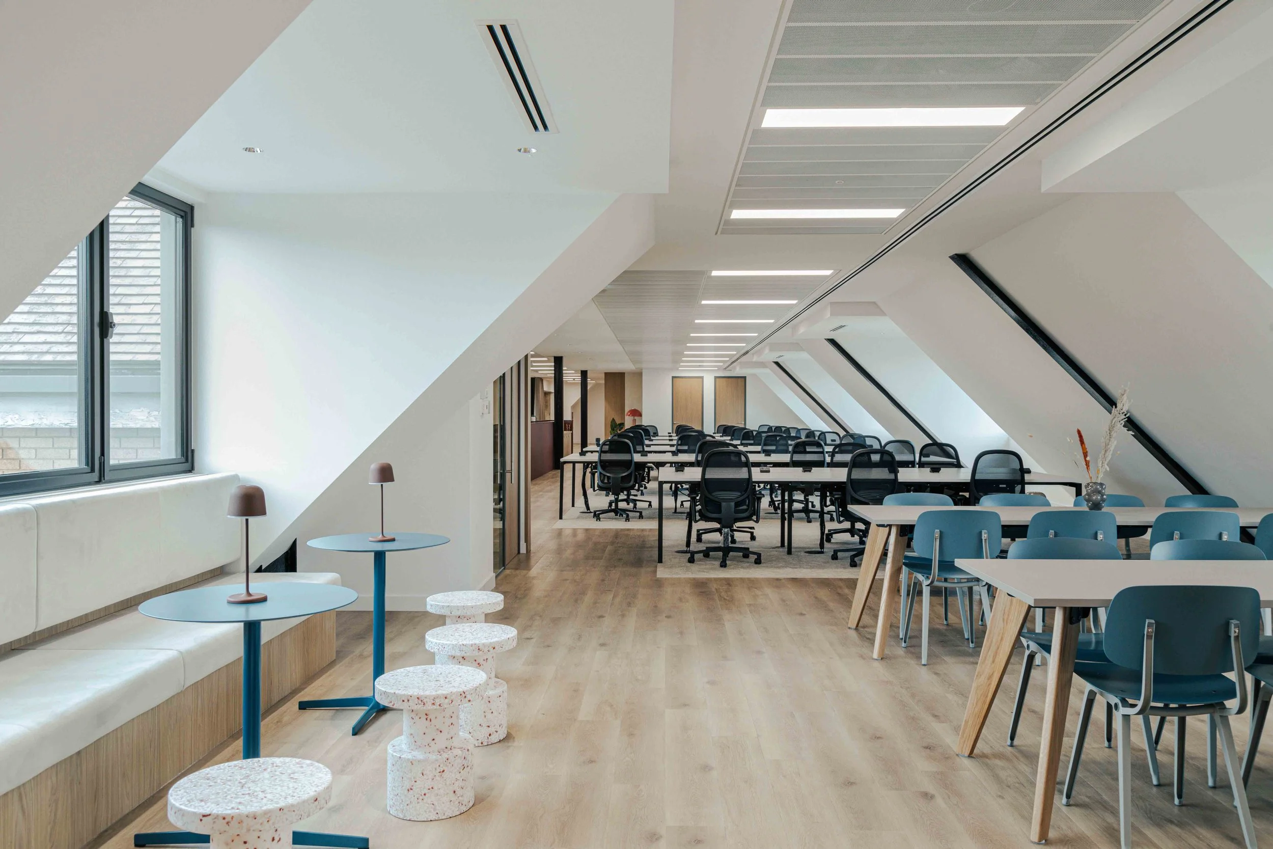 The brief called for a warm and calming arrival experience that moved away from a traditional corporate lobby towards something more inviting and design-led. A bespoke tiled floor anchors the space, adding character and identity from the moment you enter. Warm timber panelling was introduced to soften the environment and bring a residential quality to the reception, creating a welcoming backdrop for the desk and waiting area. Bespoke banquette seating completes the scheme, offering a comfortable, crafted touchpoint that enhances both functionality and atmosphere. Together, these elements deliver a refined, comfortable, and distinctive entrance that sets the tone for the rest of the building.