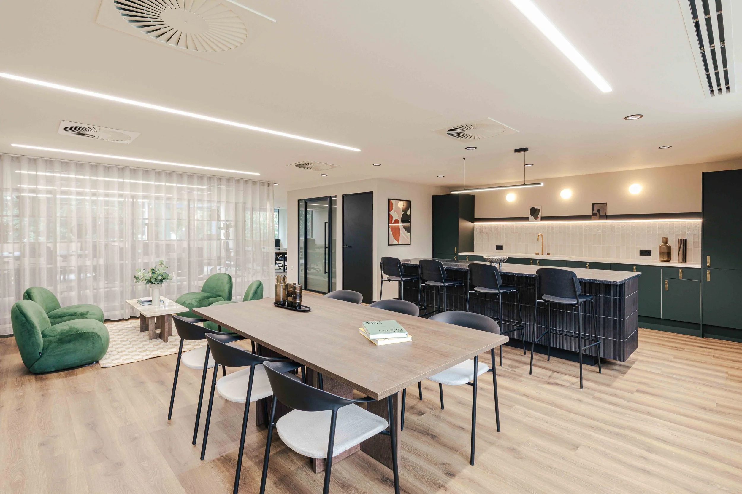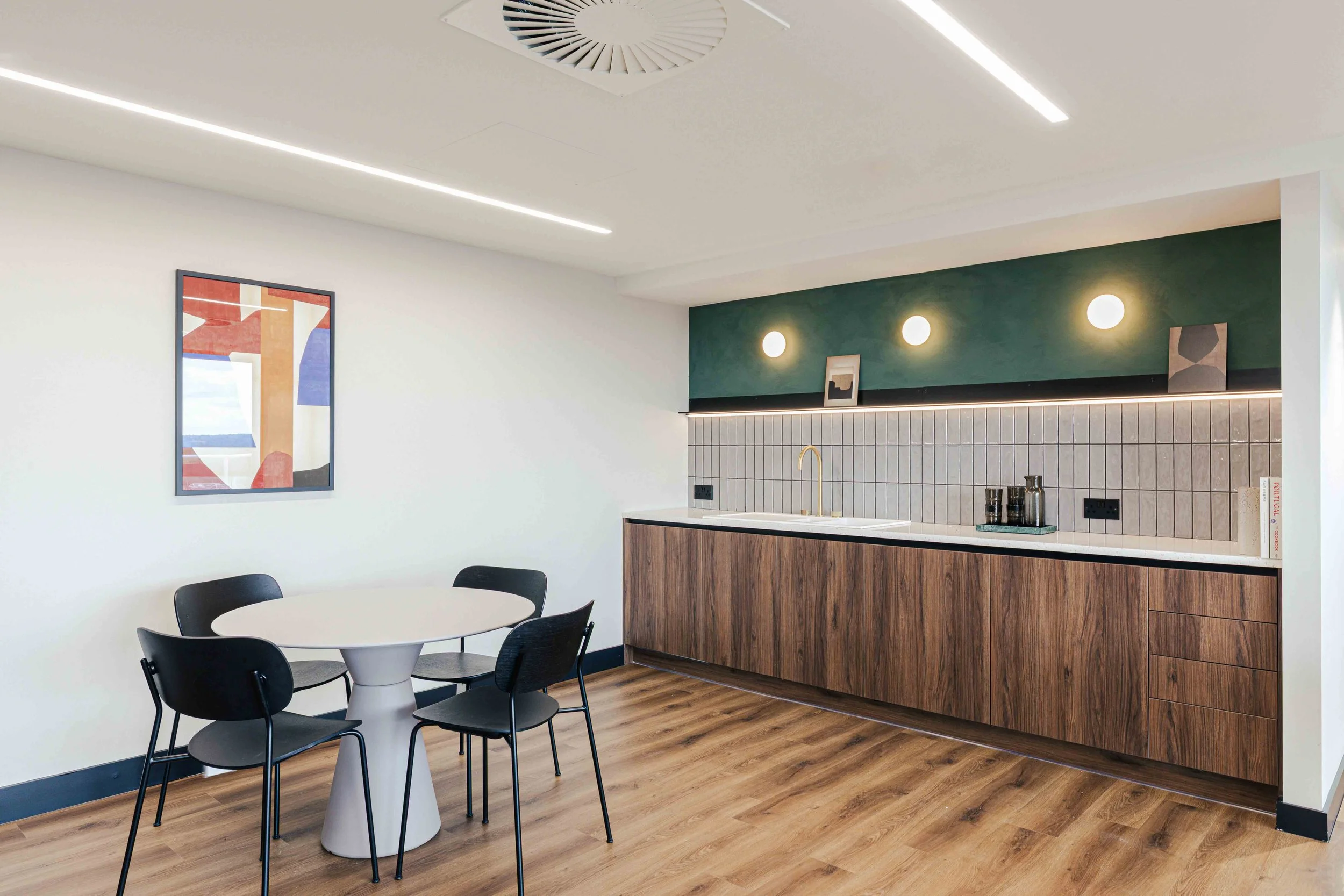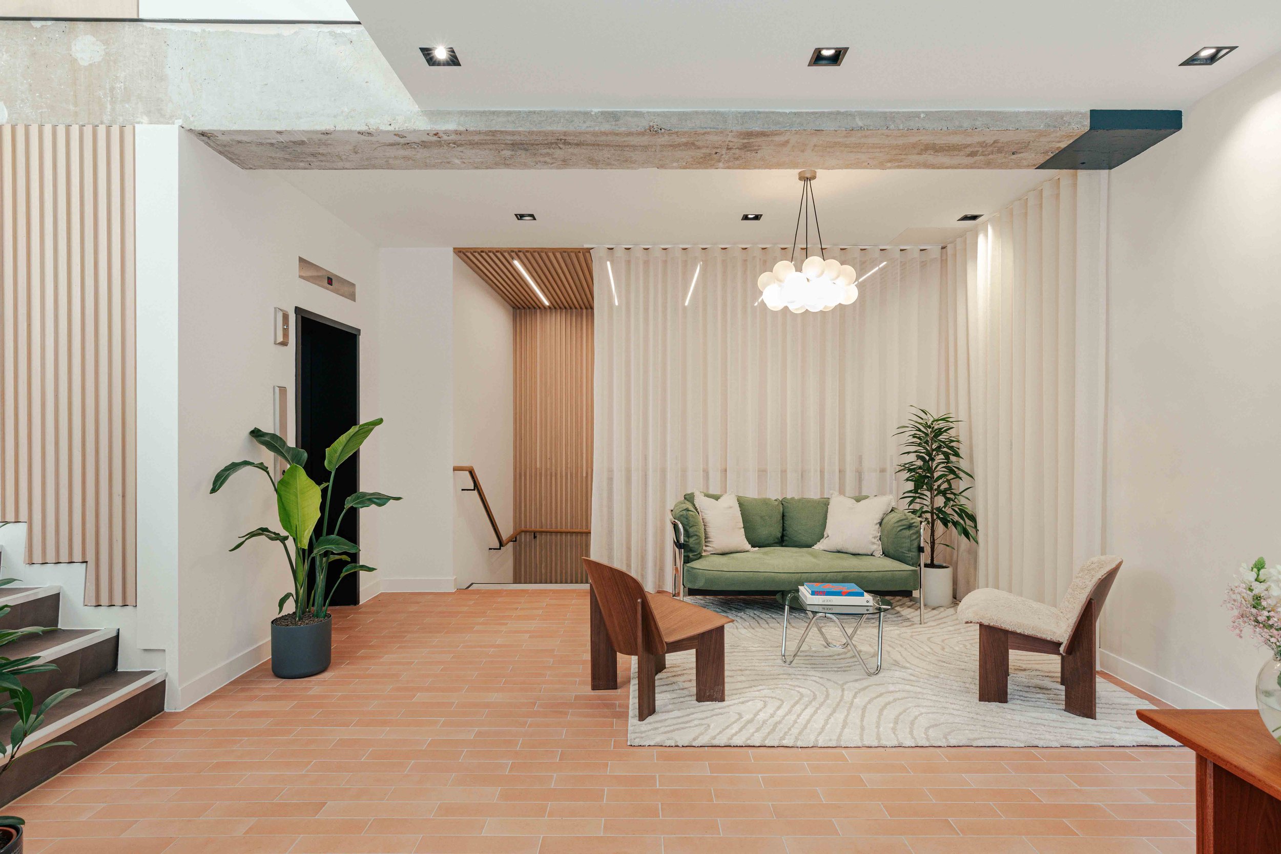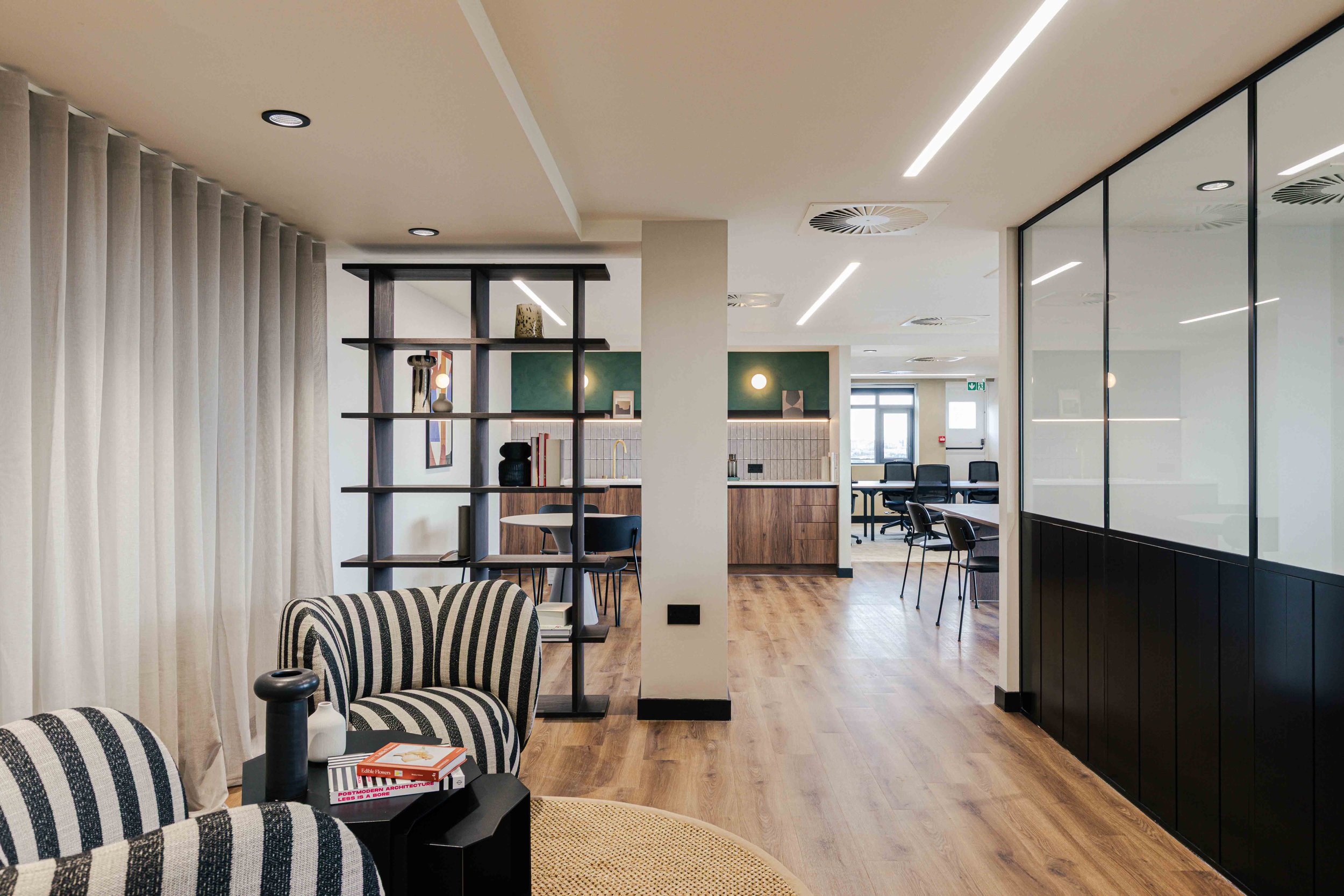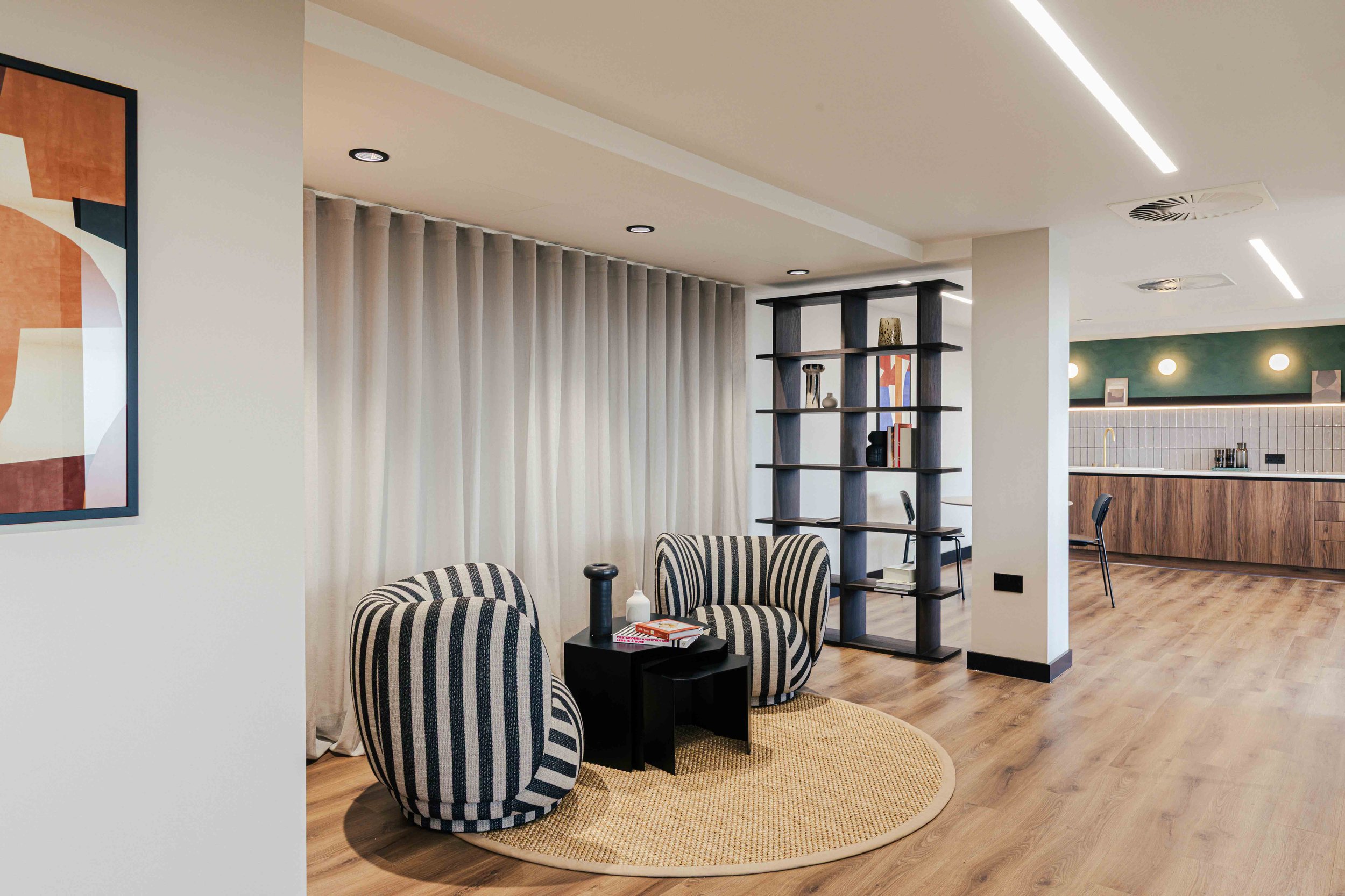 The brief called for a warm and calming arrival experience that moved away from a traditional corporate lobby towards something more inviting and design-led. A bespoke tiled floor anchors the space, adding character and identity from the moment you enter. Warm timber panelling was introduced to soften the environment and bring a residential quality to the reception, creating a welcoming backdrop for the desk and waiting area. Bespoke banquette seating completes the scheme, offering a comfortable, crafted touchpoint that enhances both functionality and atmosphere. Together, these elements deliver a refined, comfortable, and distinctive entrance that sets the tone for the rest of the building.