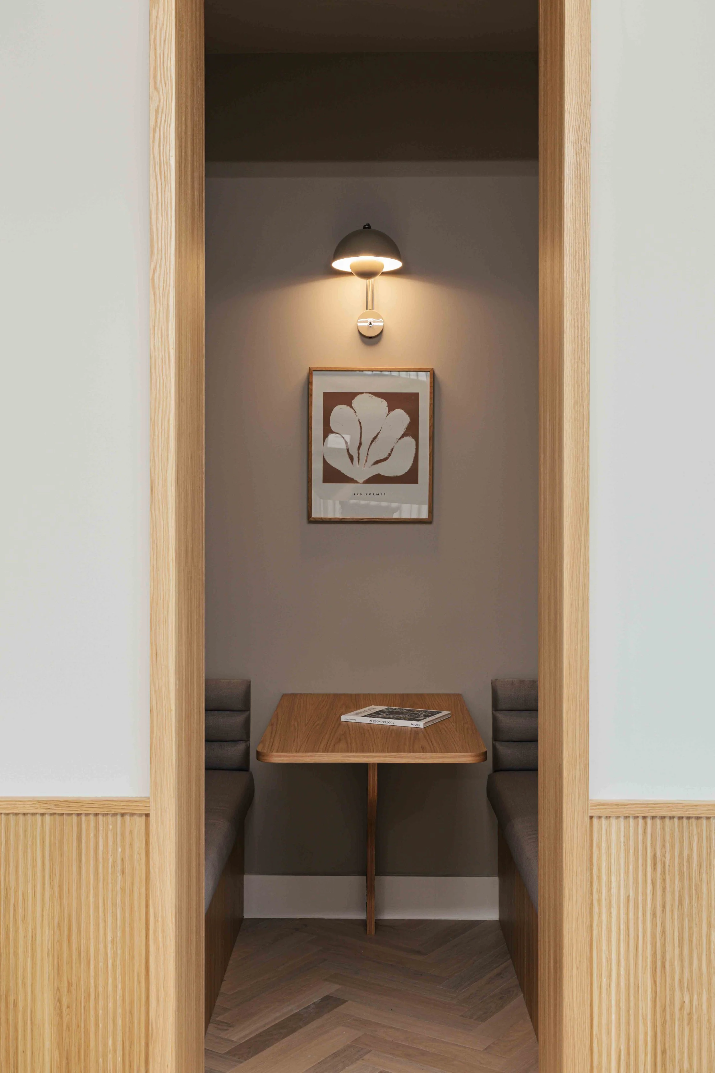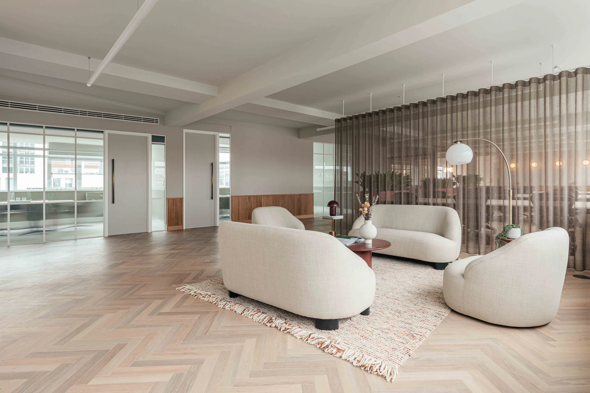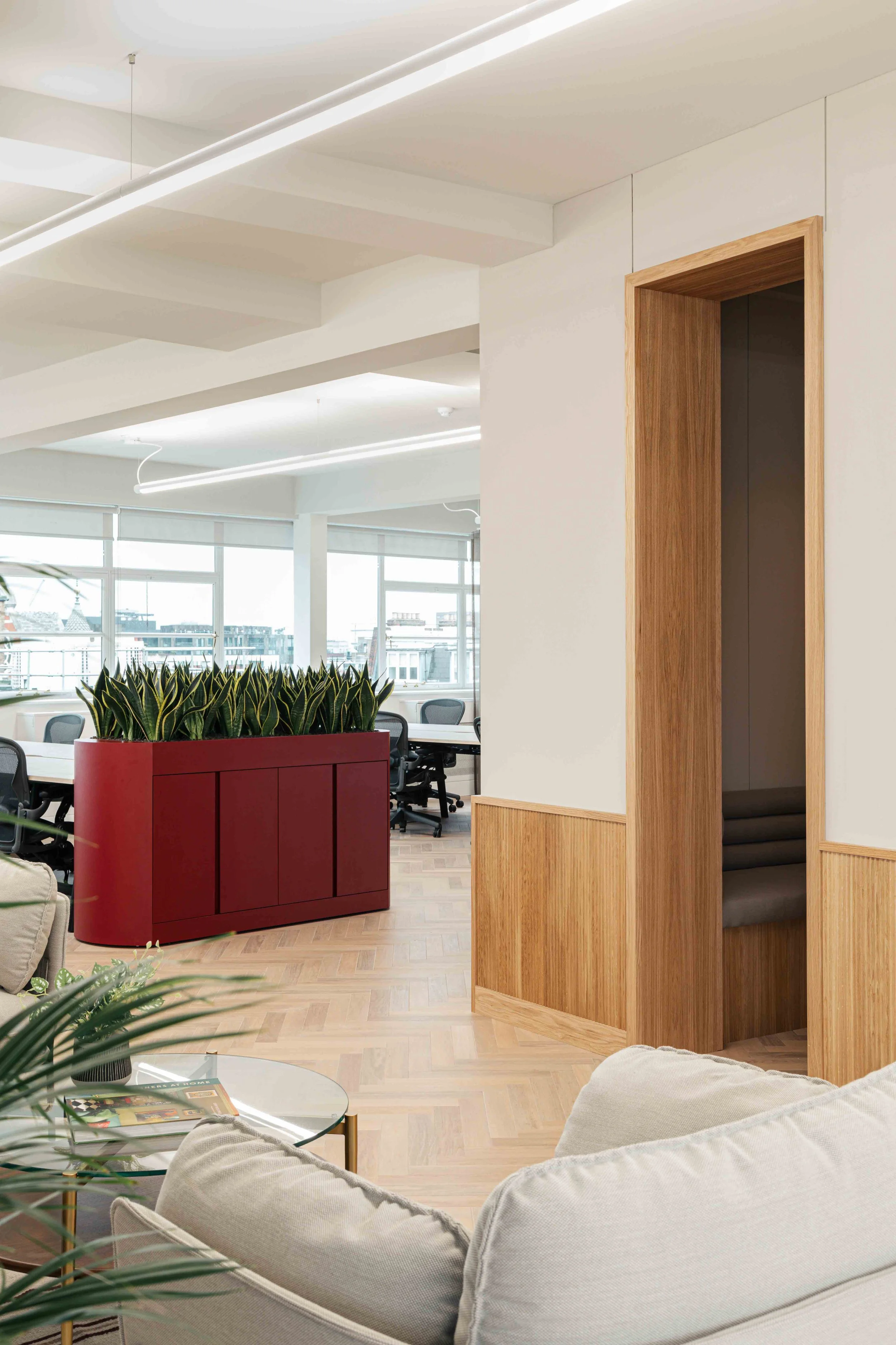 The brief called for a warm and calming arrival experience that moved away from a traditional corporate lobby towards something more inviting and design-led. A bespoke tiled floor anchors the space, adding character and identity from the moment you enter. Warm timber panelling was introduced to soften the environment and bring a residential quality to the reception, creating a welcoming backdrop for the desk and waiting area. Bespoke banquette seating completes the scheme, offering a comfortable, crafted touchpoint that enhances both functionality and atmosphere. Together, these elements deliver a refined, comfortable, and distinctive entrance that sets the tone for the rest of the building.