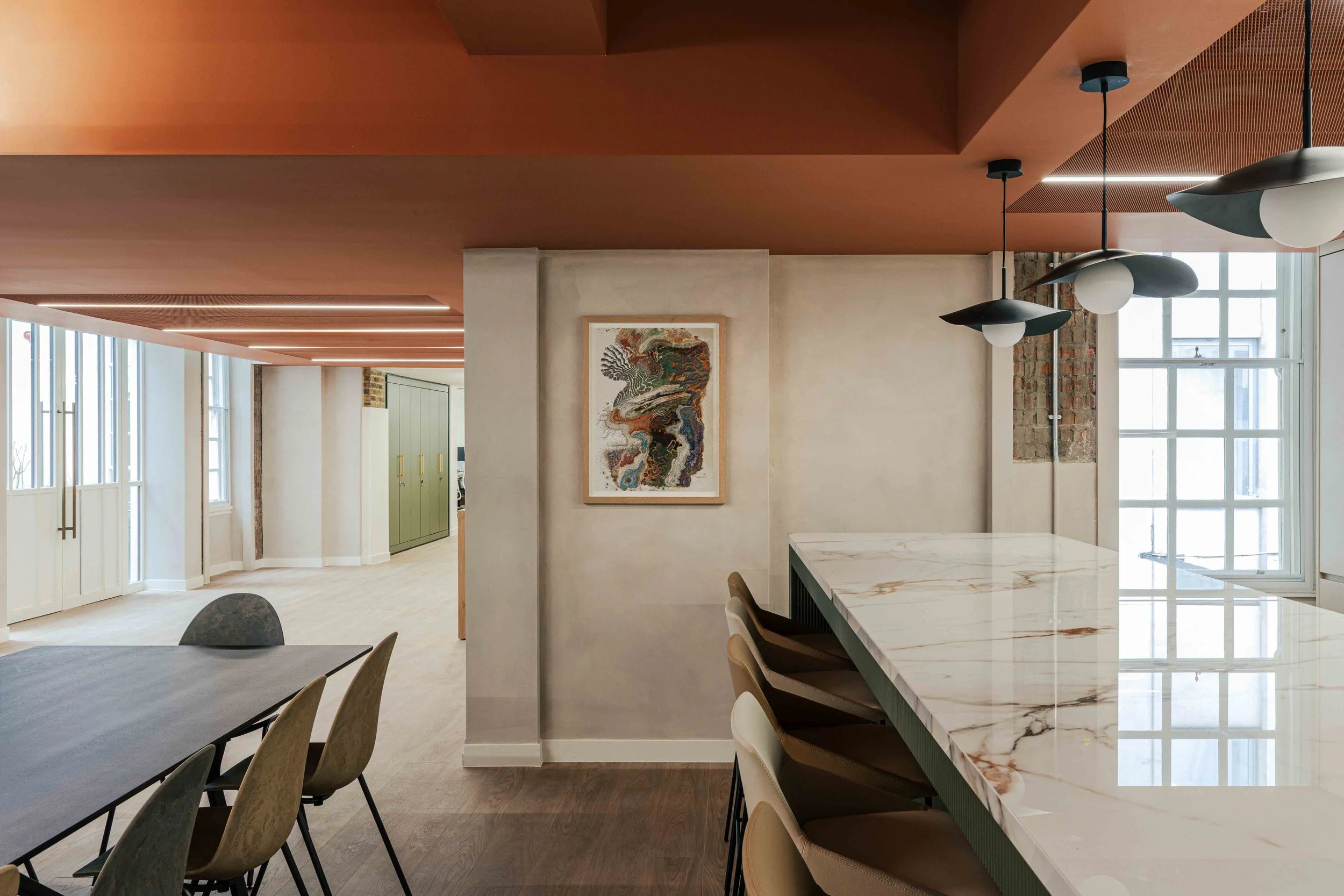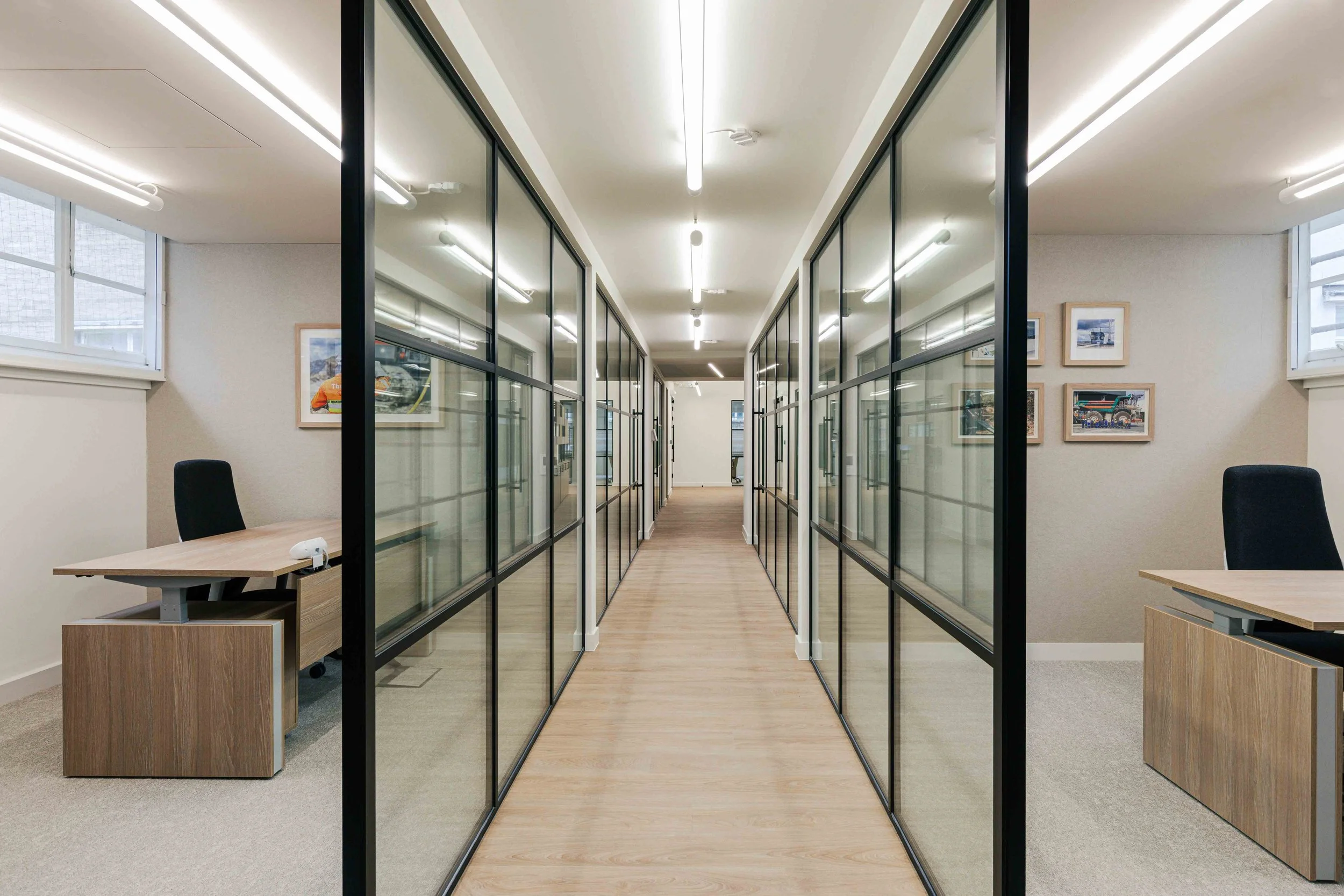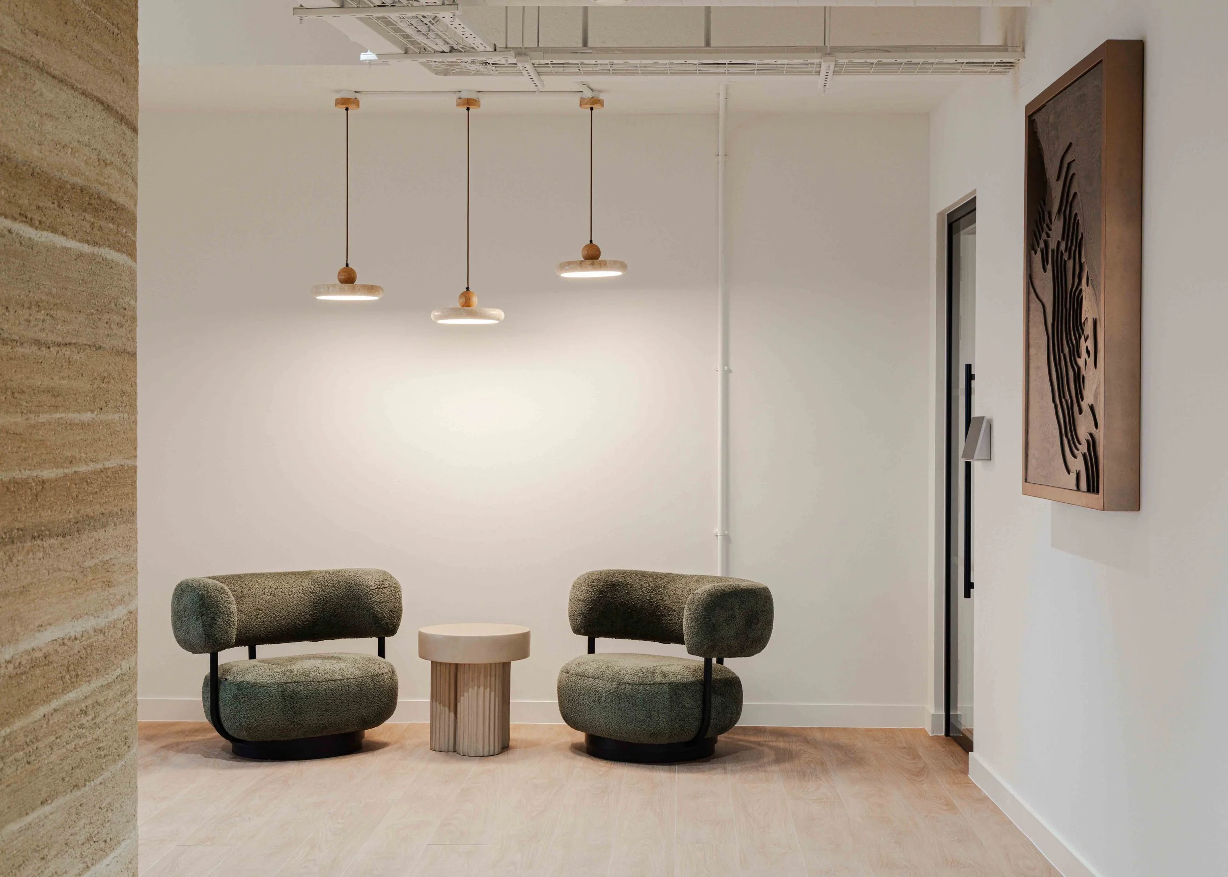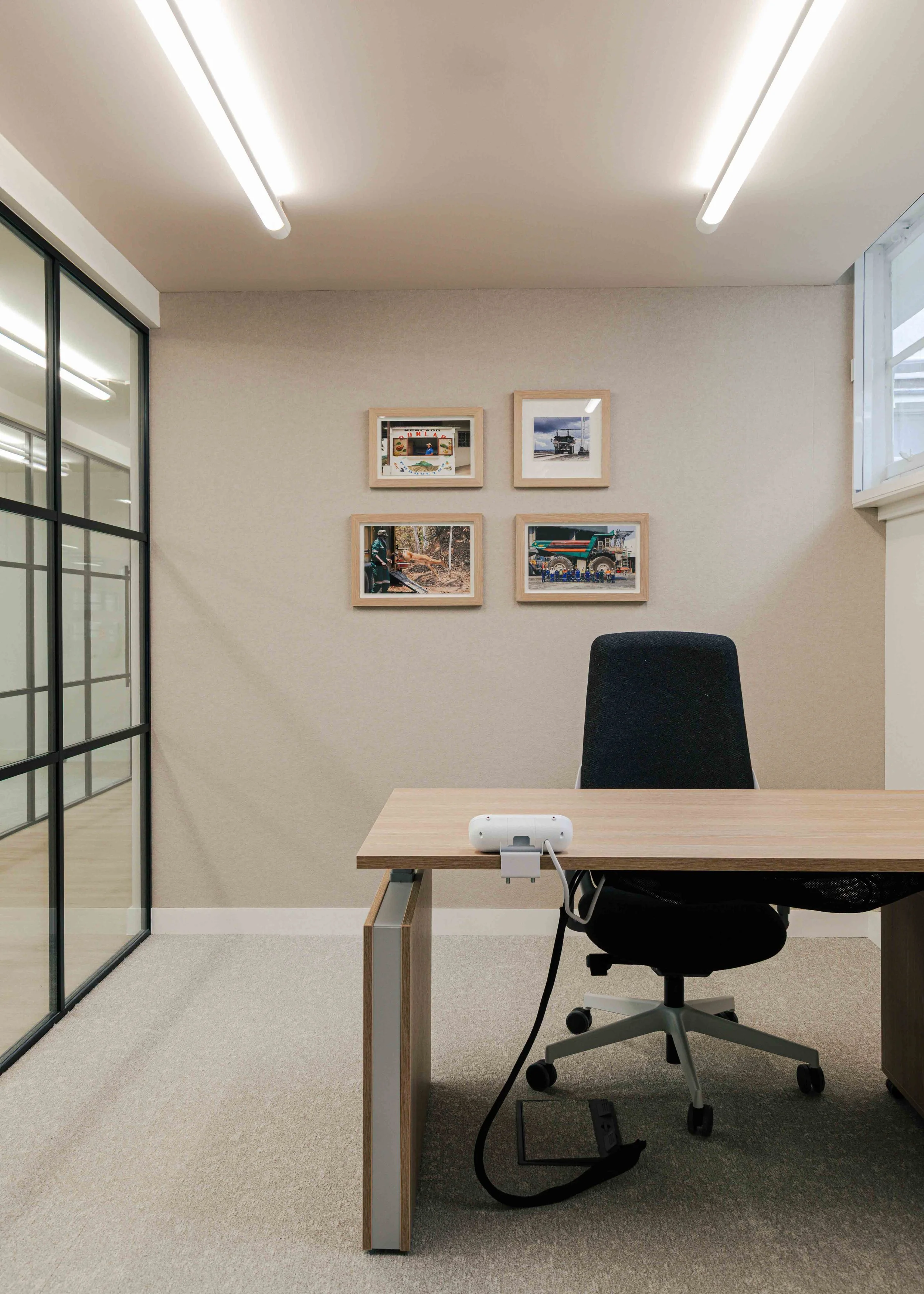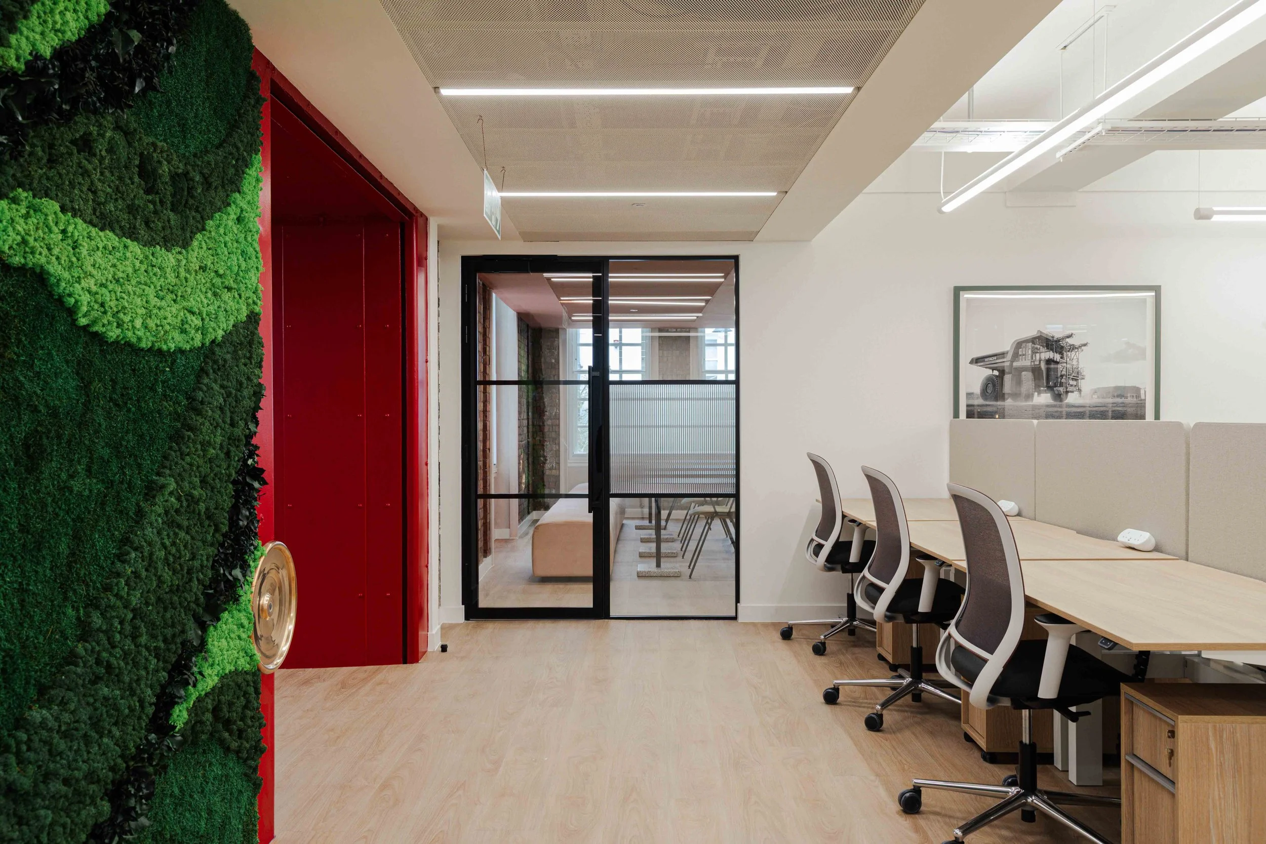 Hero moments throughout the office elevate the overall experience. Bespoke artwork and three dimensional sculptural pieces crafted from metal were carefully curated to celebrate the landscapes and materials of mining, bringing a sense of narrative and identity into the space. These elements act as visual focal points, reinforcing the brand story and creating a memorable headquarters environment.