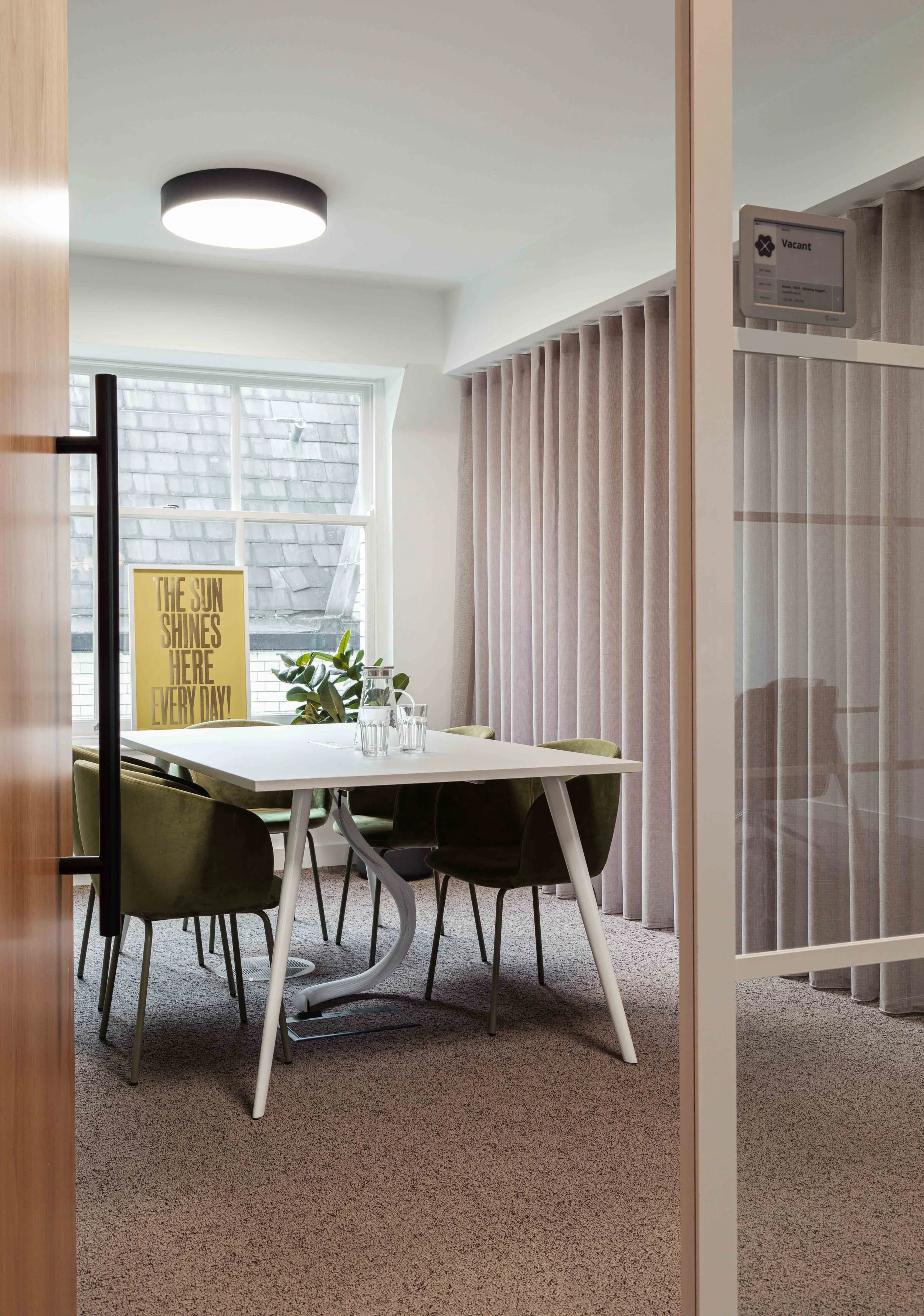 The layout naturally divides the workspace into two key zones: a dedicated suite of meeting rooms and a generous open-plan desking area. These are anchored by a central tea point and breakout space, positioned beneath a skylight and flanked by large perimeter windows. This central hub benefits from abundant natural light, creating a bright, welcoming heart to the office that encourages collaboration and informal interaction. Clear circulation from the lift lobby ensures both zones are easily accessible and intuitively connected.