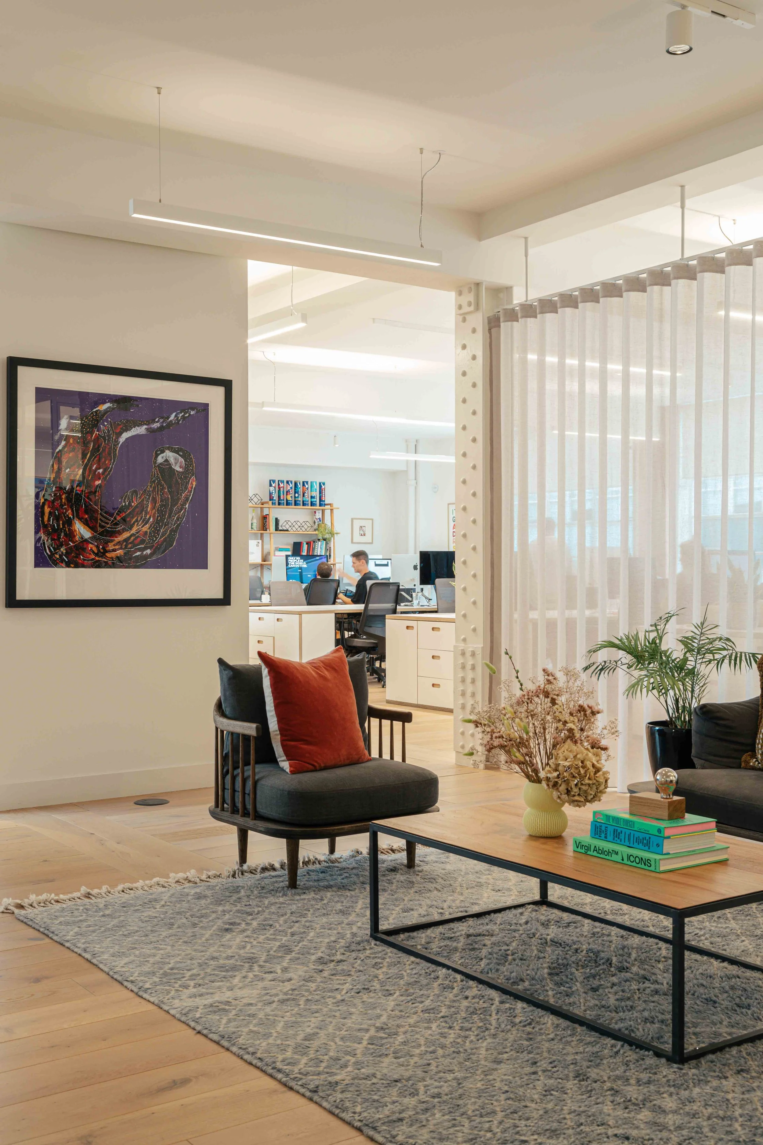 The brief called for a warm and calming arrival experience that moved away from a traditional corporate lobby towards something more inviting and design-led. A bespoke tiled floor anchors the space, adding character and identity from the moment you enter. Warm timber panelling was introduced to soften the environment and bring a residential quality to the reception, creating a welcoming backdrop for the desk and waiting area. Bespoke banquette seating completes the scheme, offering a comfortable, crafted touchpoint that enhances both functionality and atmosphere. Together, these elements deliver a refined, comfortable, and distinctive entrance that sets the tone for the rest of the building.