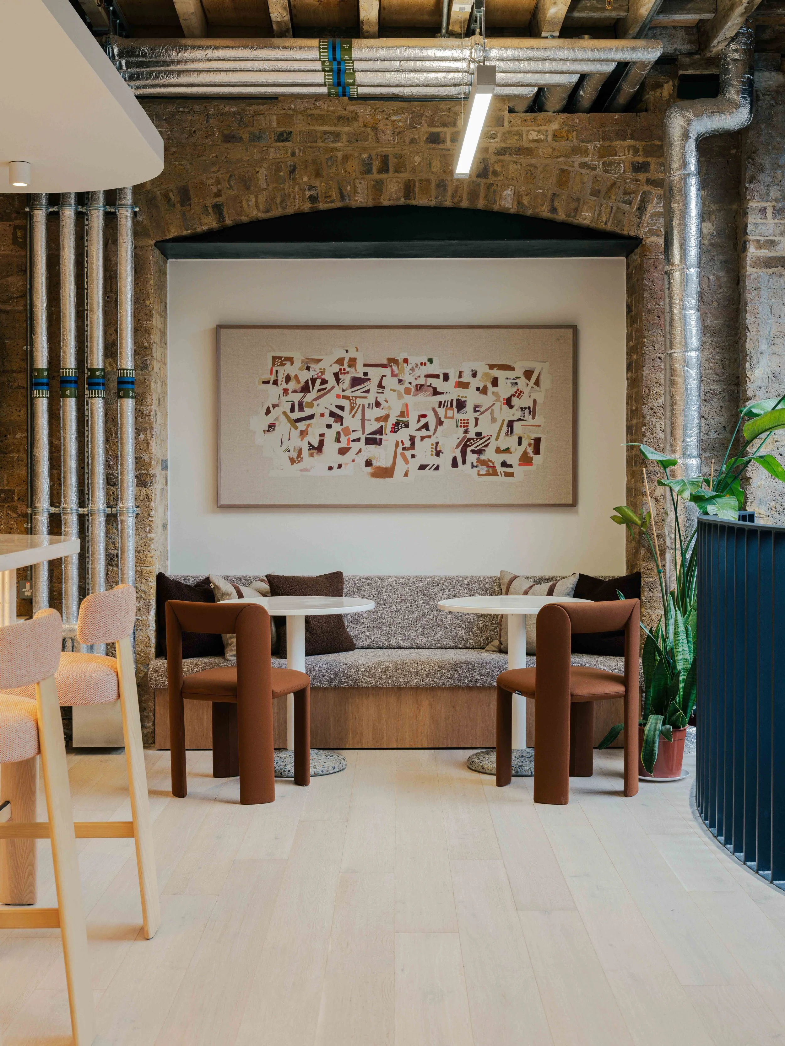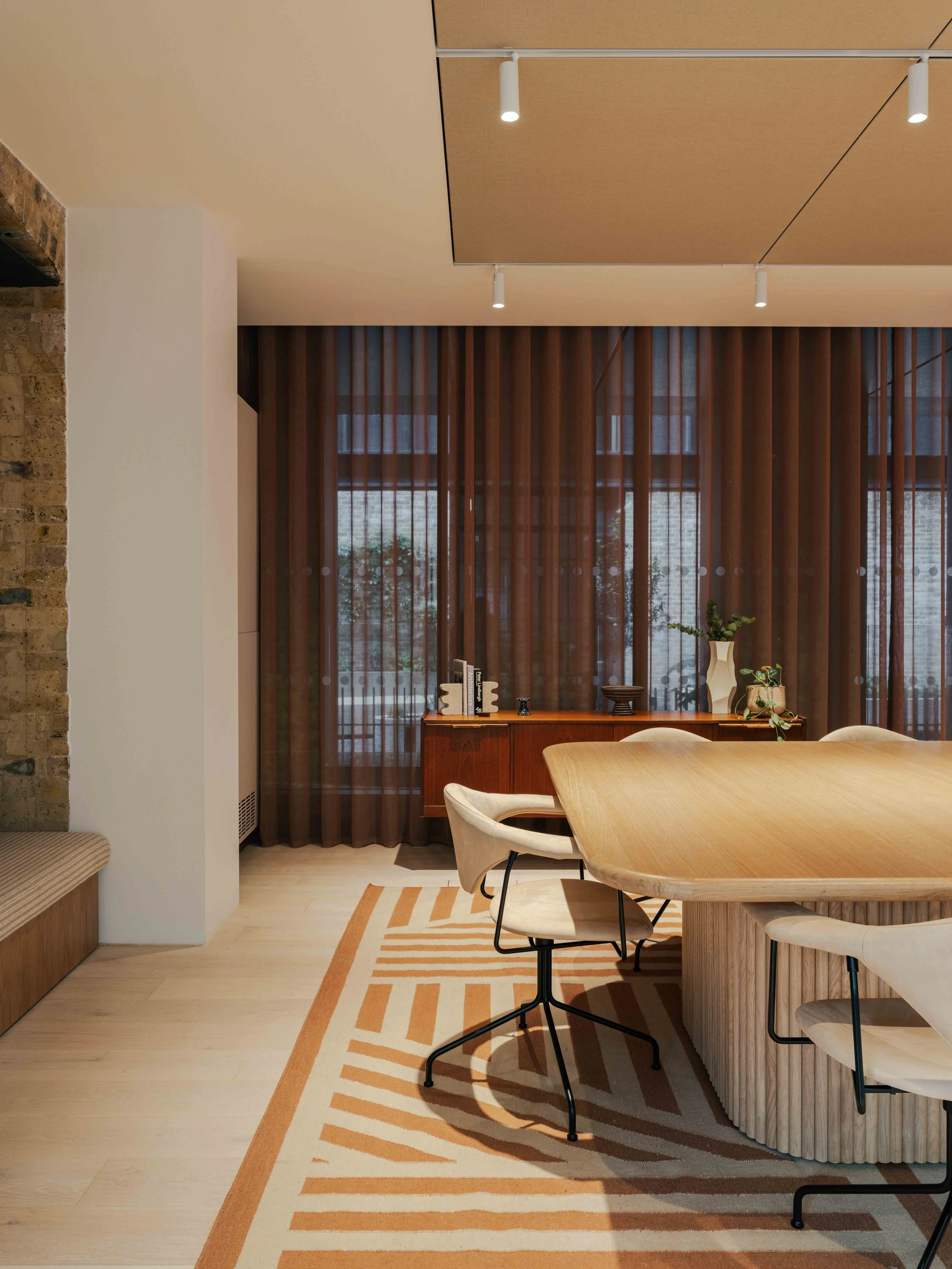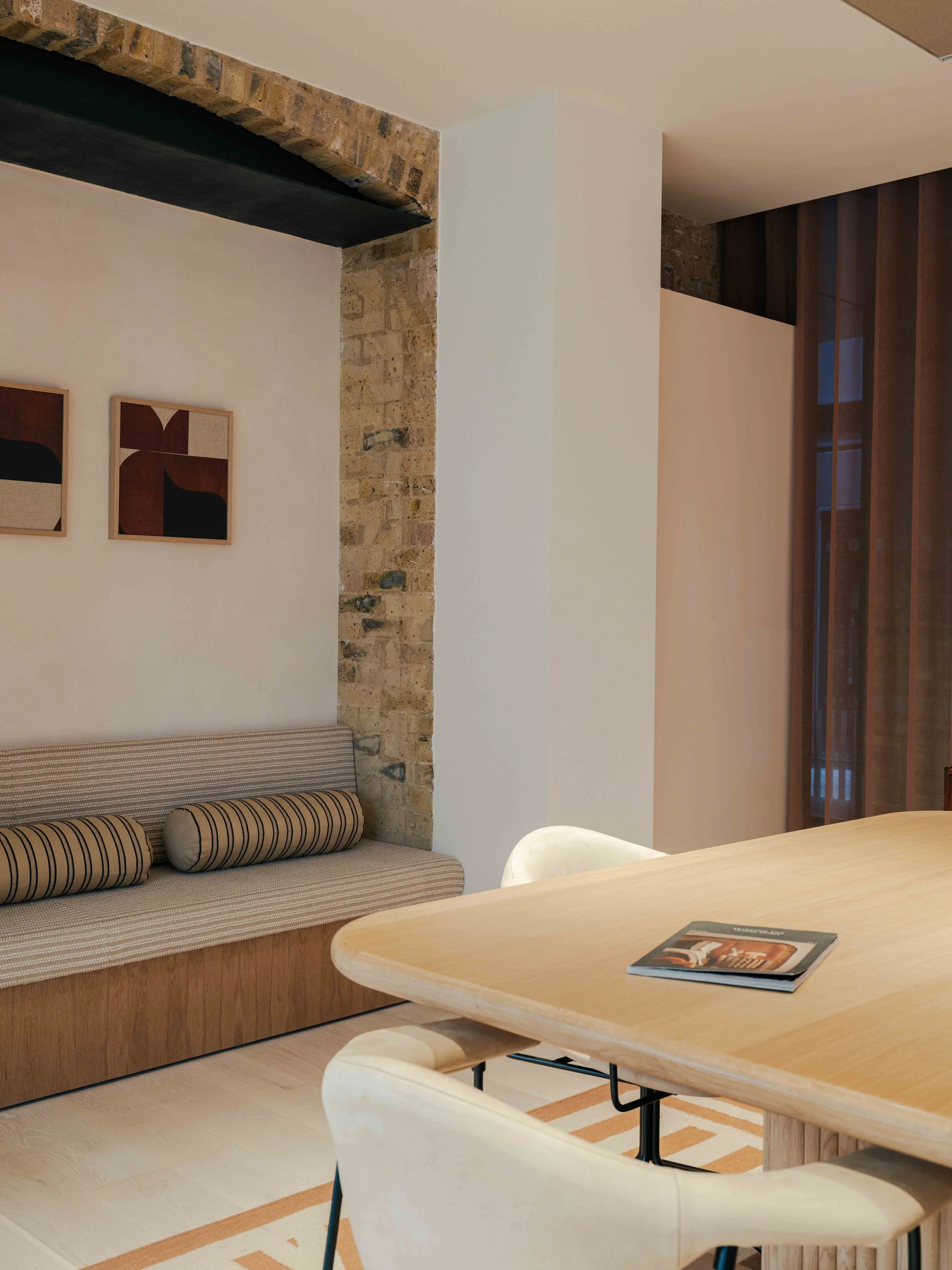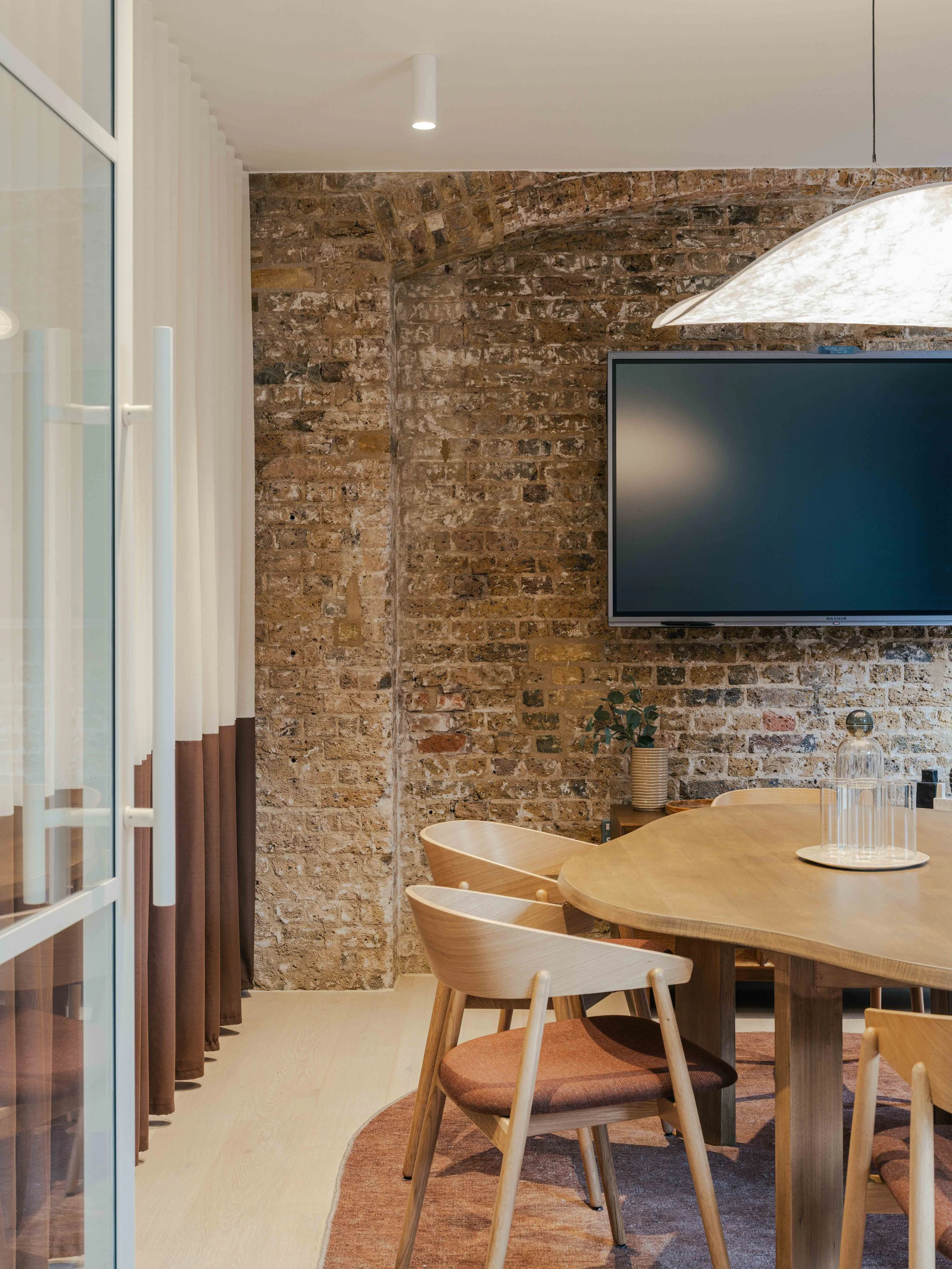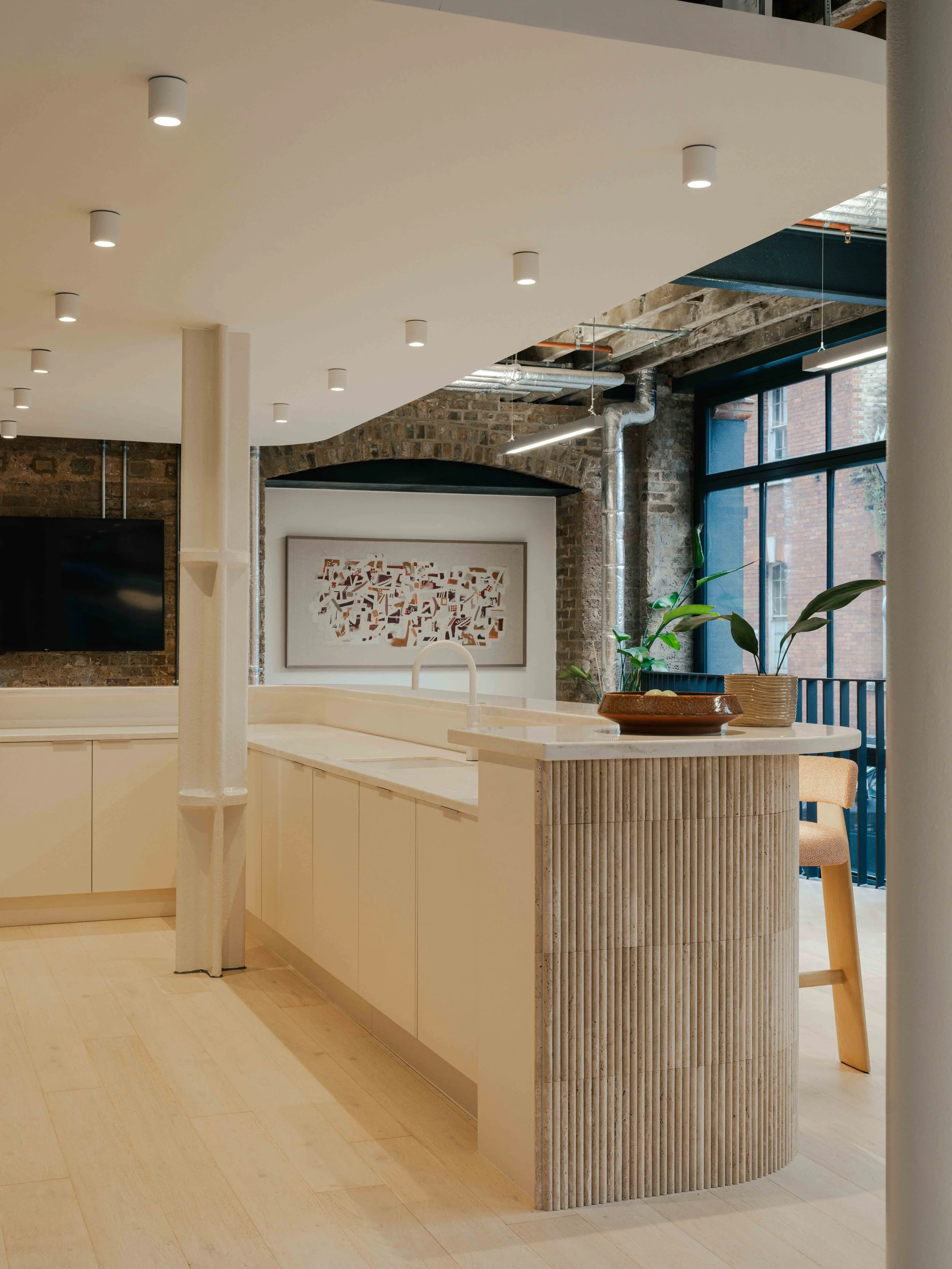 The creative direction for the space was to honour and celebrate the building’s heritage and architectural detailing, while introducing a calm and timeless palette that would allow moments of playful personality to emerge with confidence. It was important to retain the original warehouse features, exposed brickwork, Crittall windows and visible services that speak to its material honesty. Against this backdrop, we introduced layered, refined elements, clean lined ceilings, warm timber panelling and polished finishes, creating a thoughtful juxtaposition that softens the industrial shell with a sense of sophistication and calm.