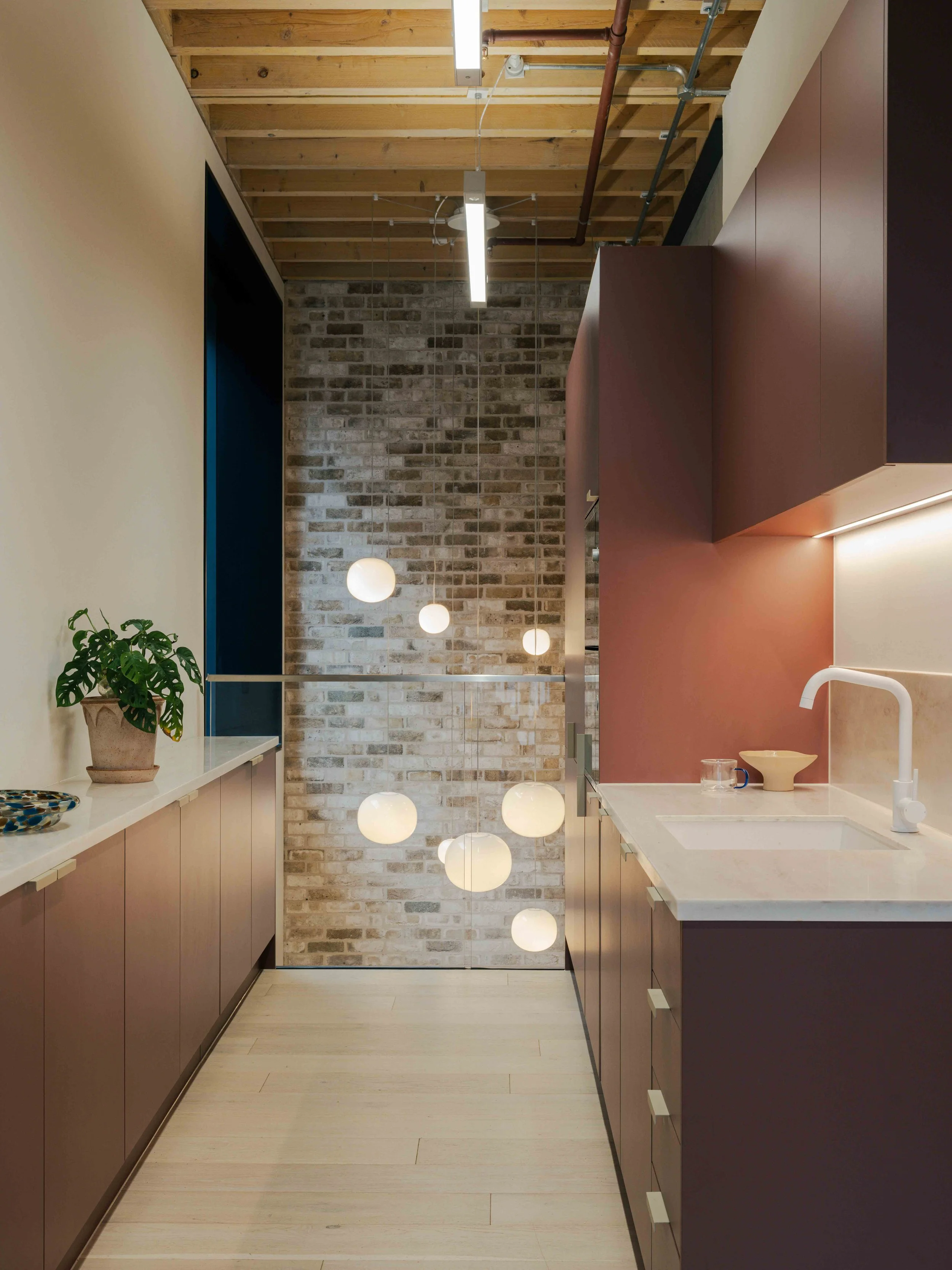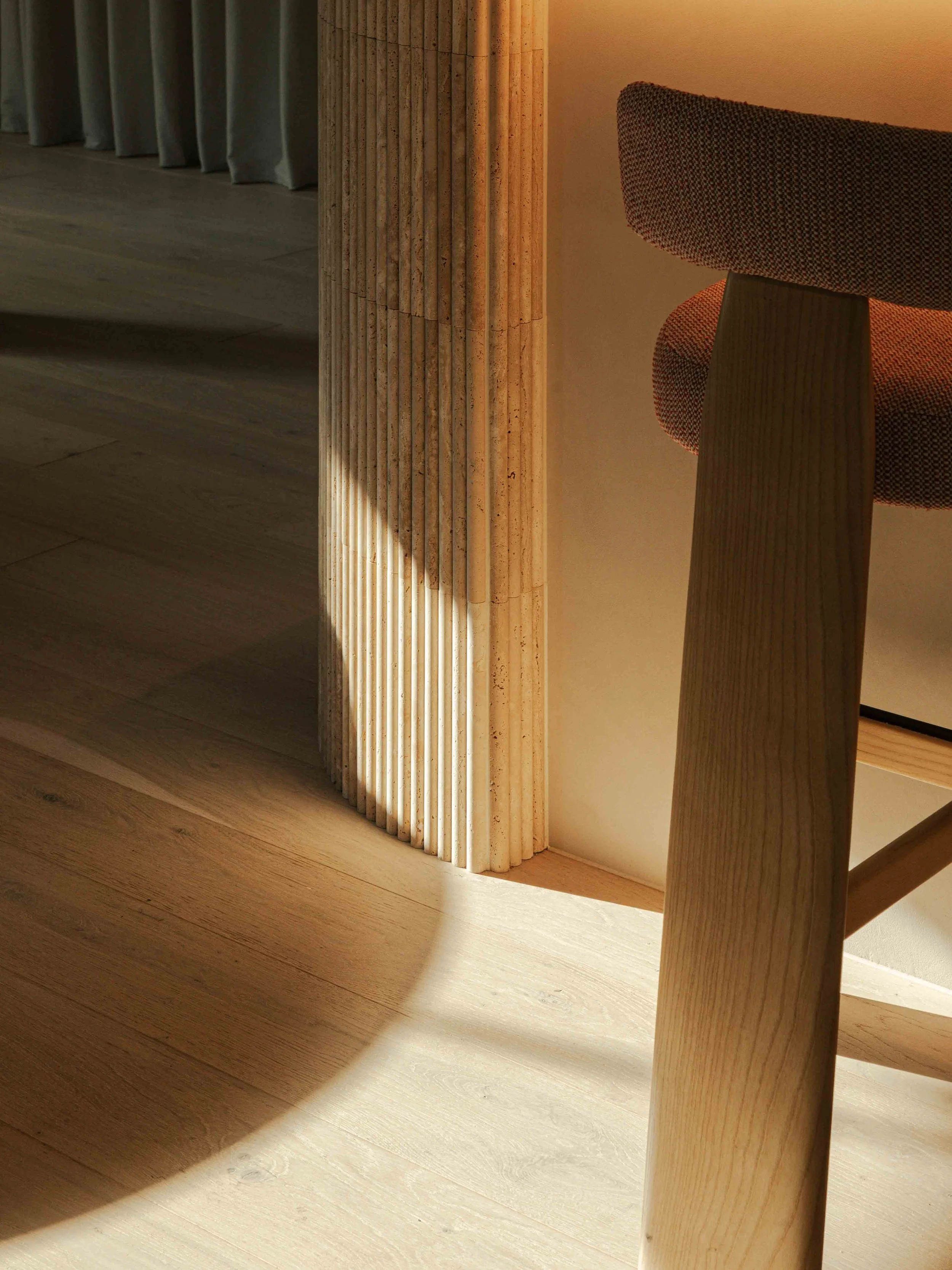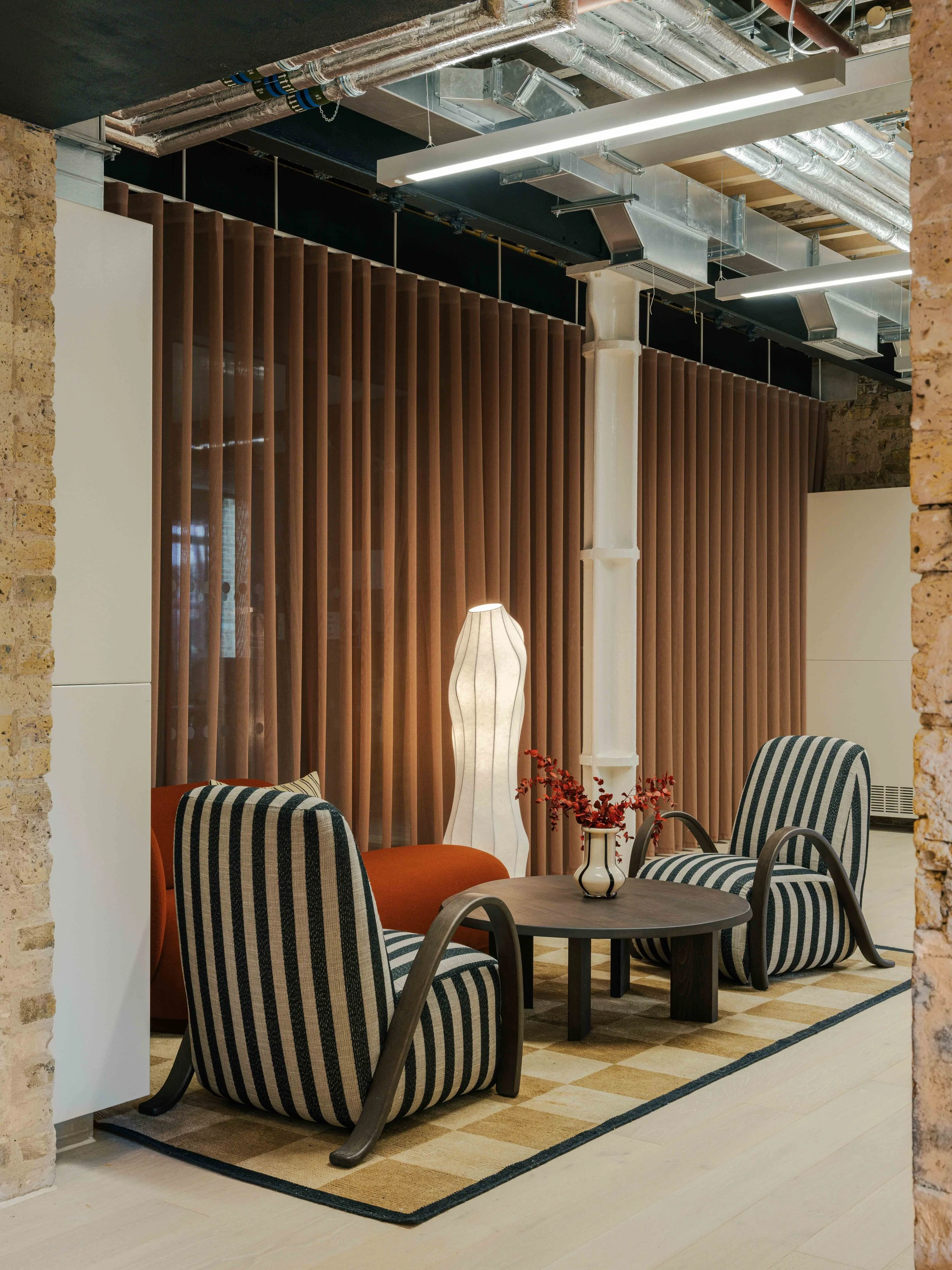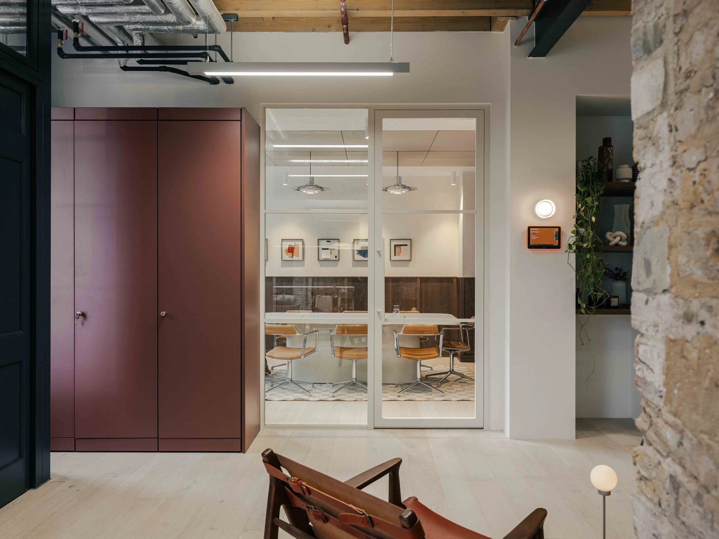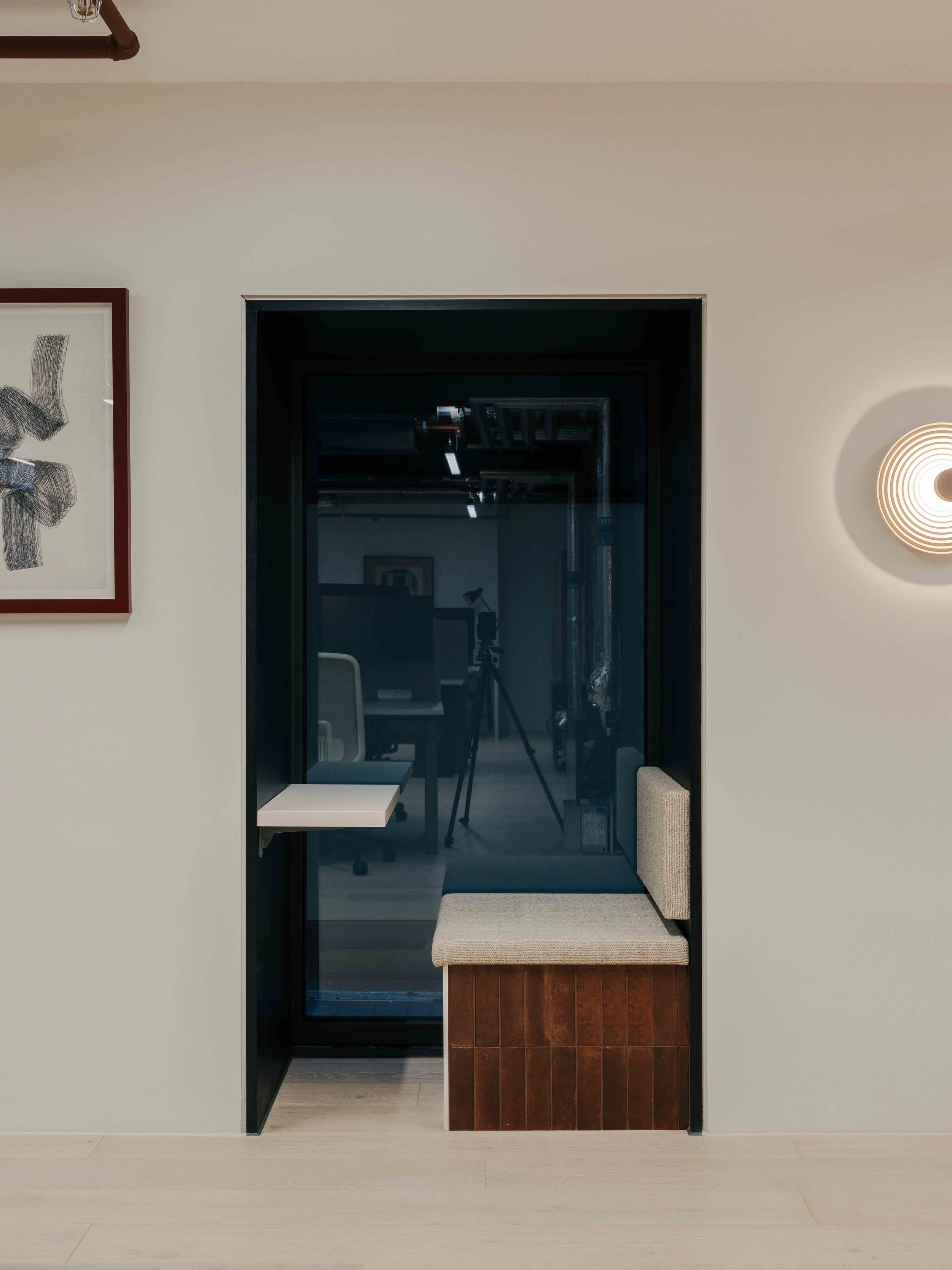The creative direction for the space was to honour and celebrate the building’s heritage and architectural detailing, while introducing a calm and timeless palette that would allow moments of playful personality to emerge with confidence. It was important to retain the original warehouse features, exposed brickwork, Crittall windows and visible services that speak to its material honesty. Against this backdrop, we introduced layered, refined elements, clean lined ceilings, warm timber panelling and polished finishes, creating a thoughtful juxtaposition that softens the industrial shell with a sense of sophistication and calm.