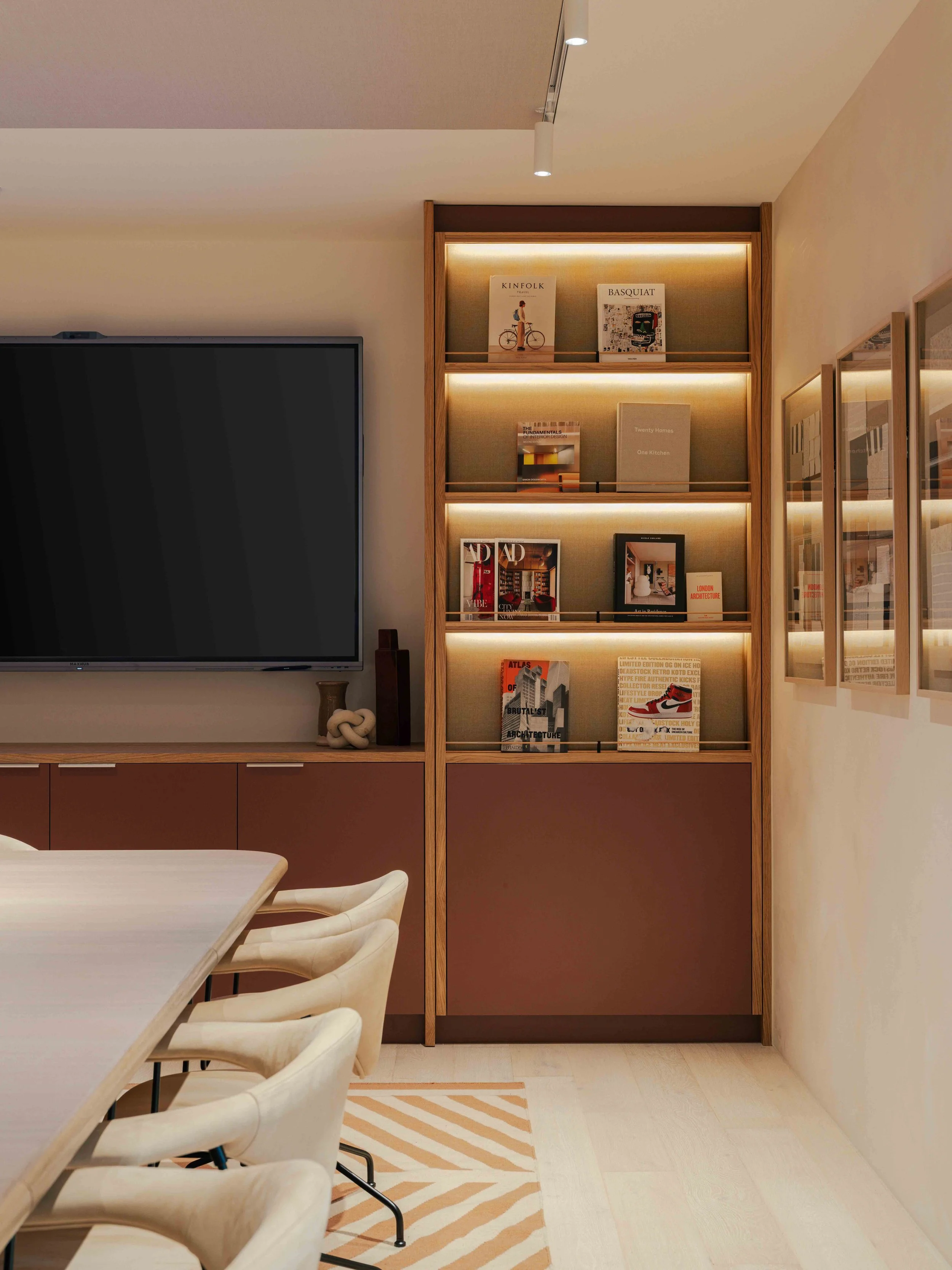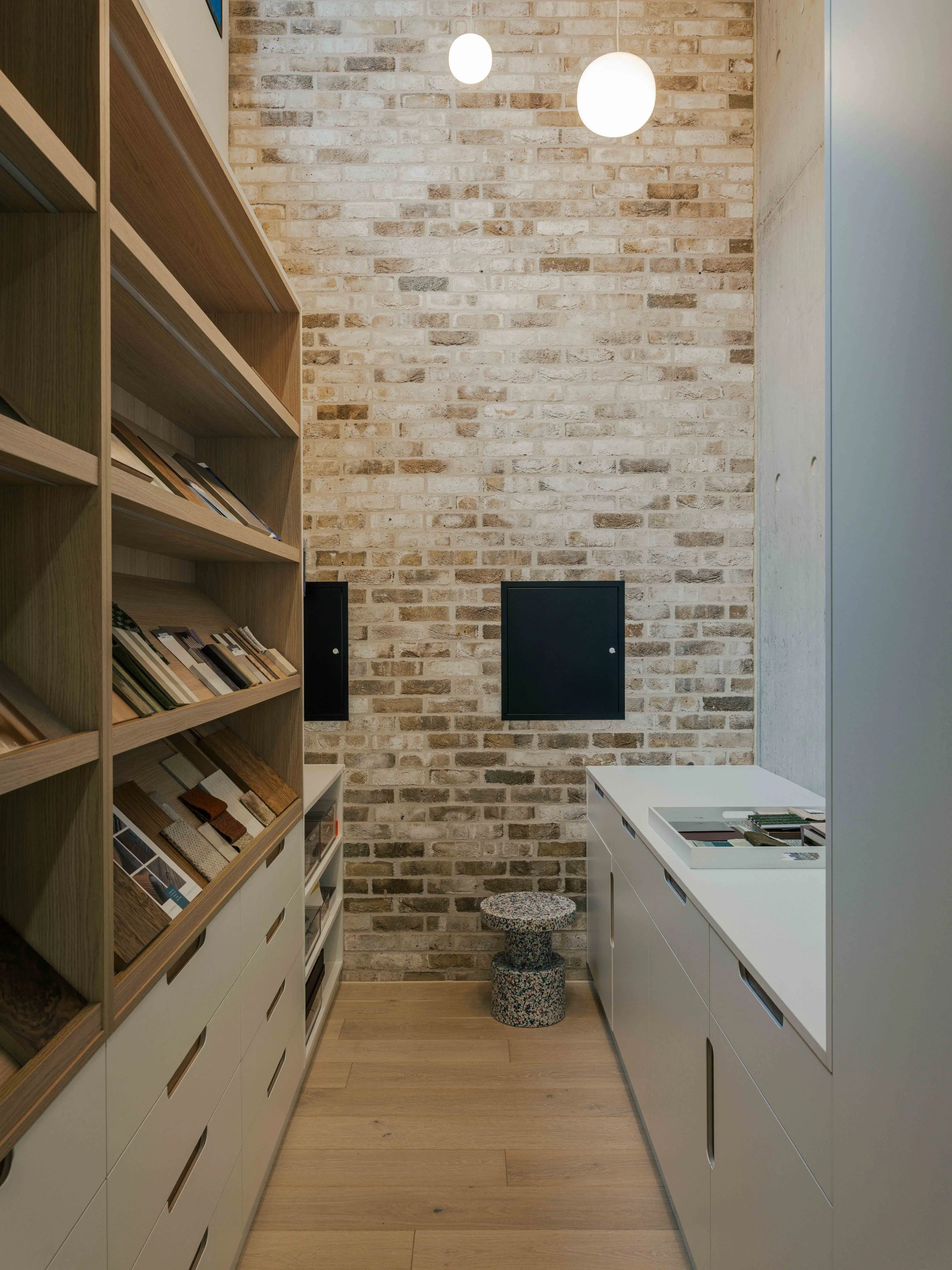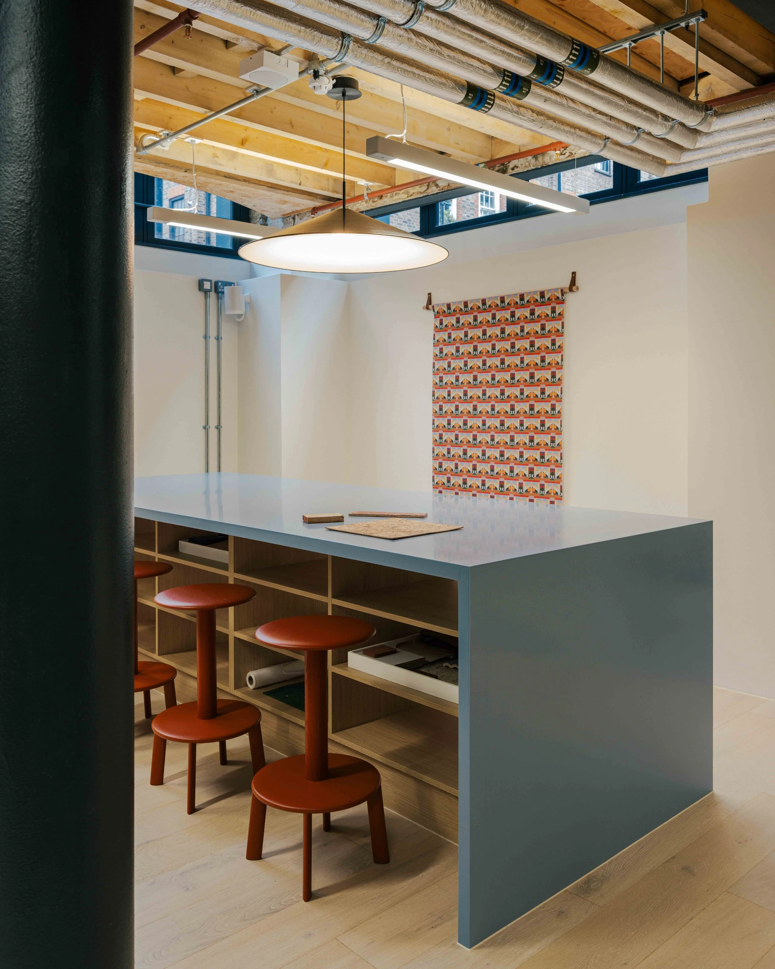 Designed with flexibility at its core, the studio offers a variety of spaces, a generous breakout area for gathering and hosting, alongside zones dedicated to focus, collaboration and informal meetings. A dedicated design library sits at the heart of the studio, encouraging material exploration and playful creativity for the team.